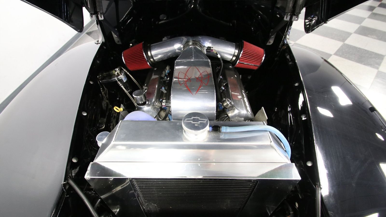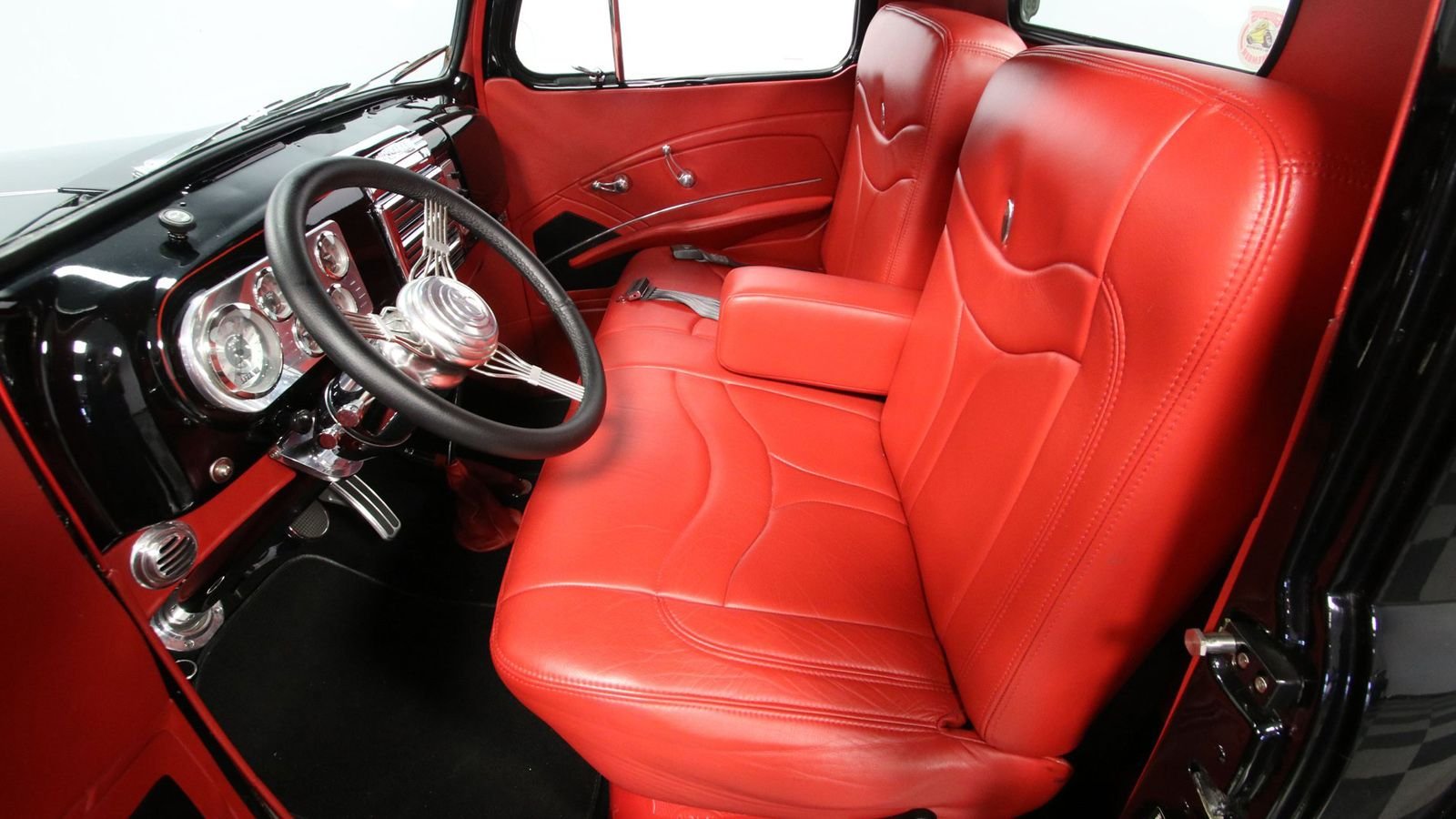 On the inside, the classic bench seat setup has been enhanced with modern upholstery and cushioning. The black and red color scheme continues here. And the level of craftsmanship in this interior shines through the photographs. The cabin maintains its classic feel, but modern creature comforts help make it easier to drive, especially considering all the power it boasts.