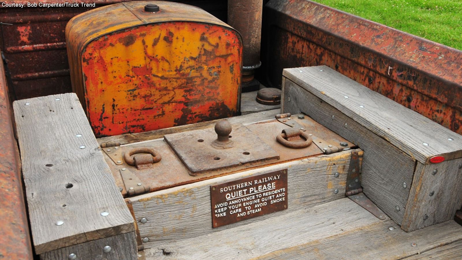 You might have noticed what looks like a sewer pipe jutting skyward from the pickup's bed. Looks, in this case, aren't deceiving—Robinson built the exhaust to exit through a set of stacks made from well casings. The pipes screw off and can be capped, allowing spent gasses to just blow through a rust hole in the side of the truck. The fuel tank is also a found object, it's a repurposed '50s-era 15-gallon combine tank. There's diesel tractor fuel cap in the original filler's location as well, but that's just for looks.