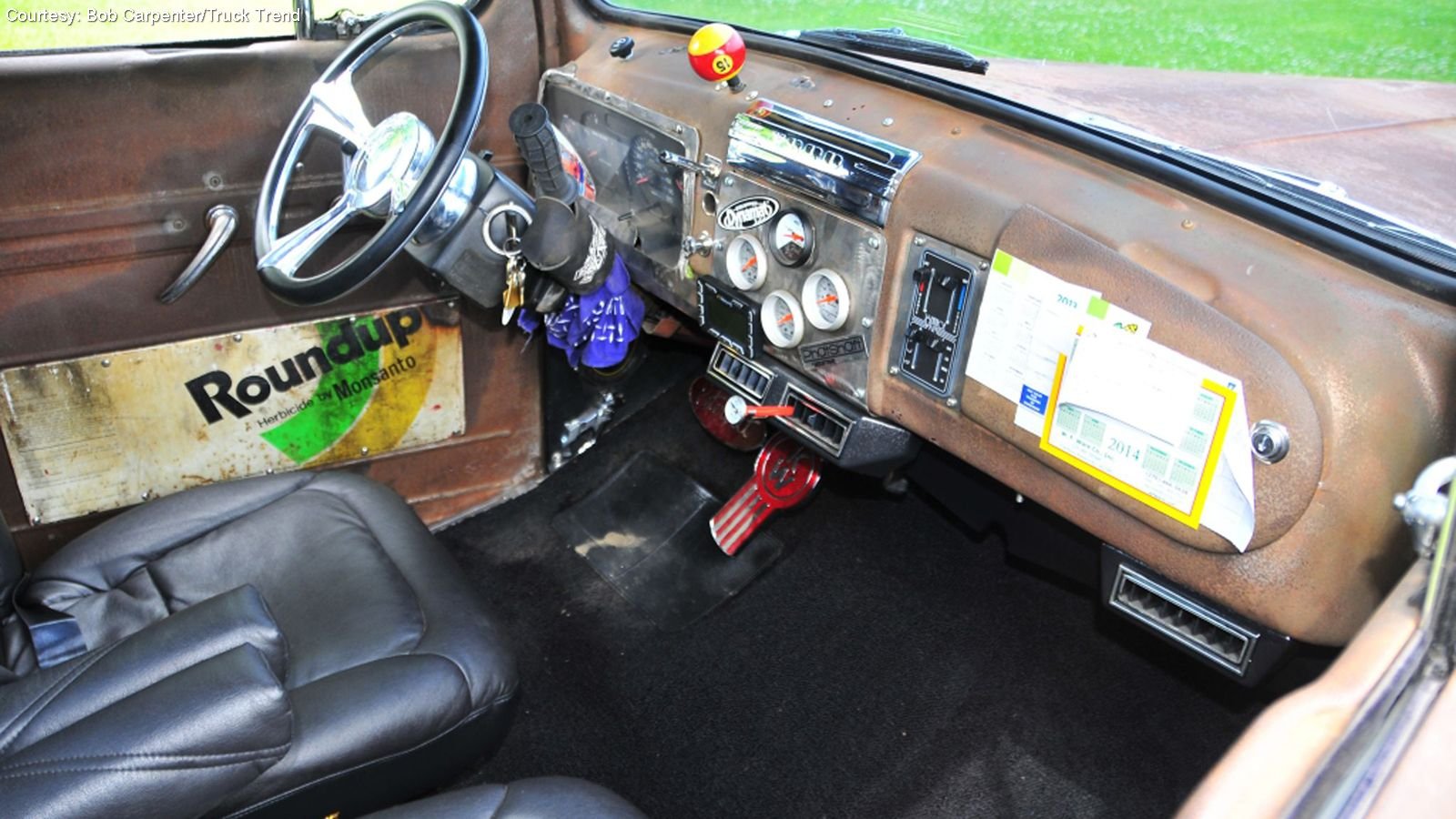 The interior was too far gone to save—patina is one thing but sitting on rusty springs is another—so Robinson added Bostrom Air Ride seats that he and his girlfriend re-did in black leather, as well as new glass and new carpet from LMC Truck. Kentucky can get toasty so they also added a Vintage Air A/C system.
