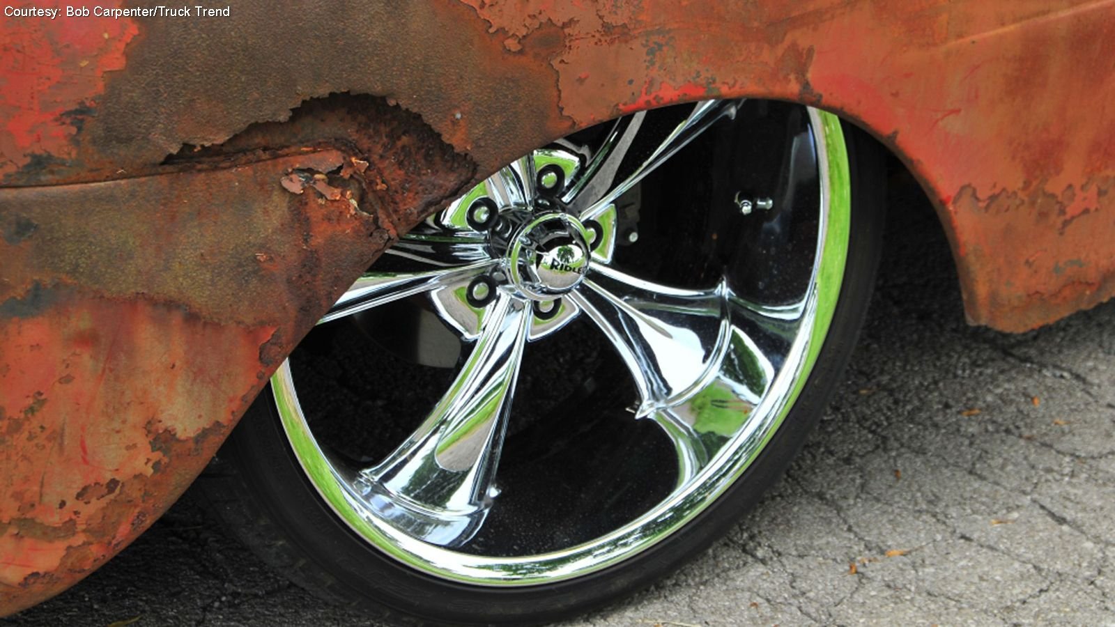 The crew separated the truck's body from its frame and then removed both front and rear axles. This gave them improved access for them to completely box the frame for added strength, with Robinson's girlfriend Jamie taking care of much of the welding. A Mustang II front suspension was grafted onto the F-1, utilizing a steering column from a Dodge Ram. The F-1 also wears Dodge disc brakes and uses a Dodge master cylinder, coupled with a Wilwood proportioning valve.