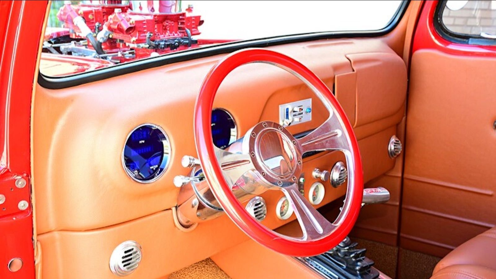 Other slick features of this truck include Dynomax mufflers, 4-inch stainless exhaust tubing, sheet metal valve covers, Vintage Air Front Runner system, and a set of custom headers. Paired to the behemoth V8 is a TCI Automotive-provided Ford C6 transmission delivering all those horses to a custom driveshaft.