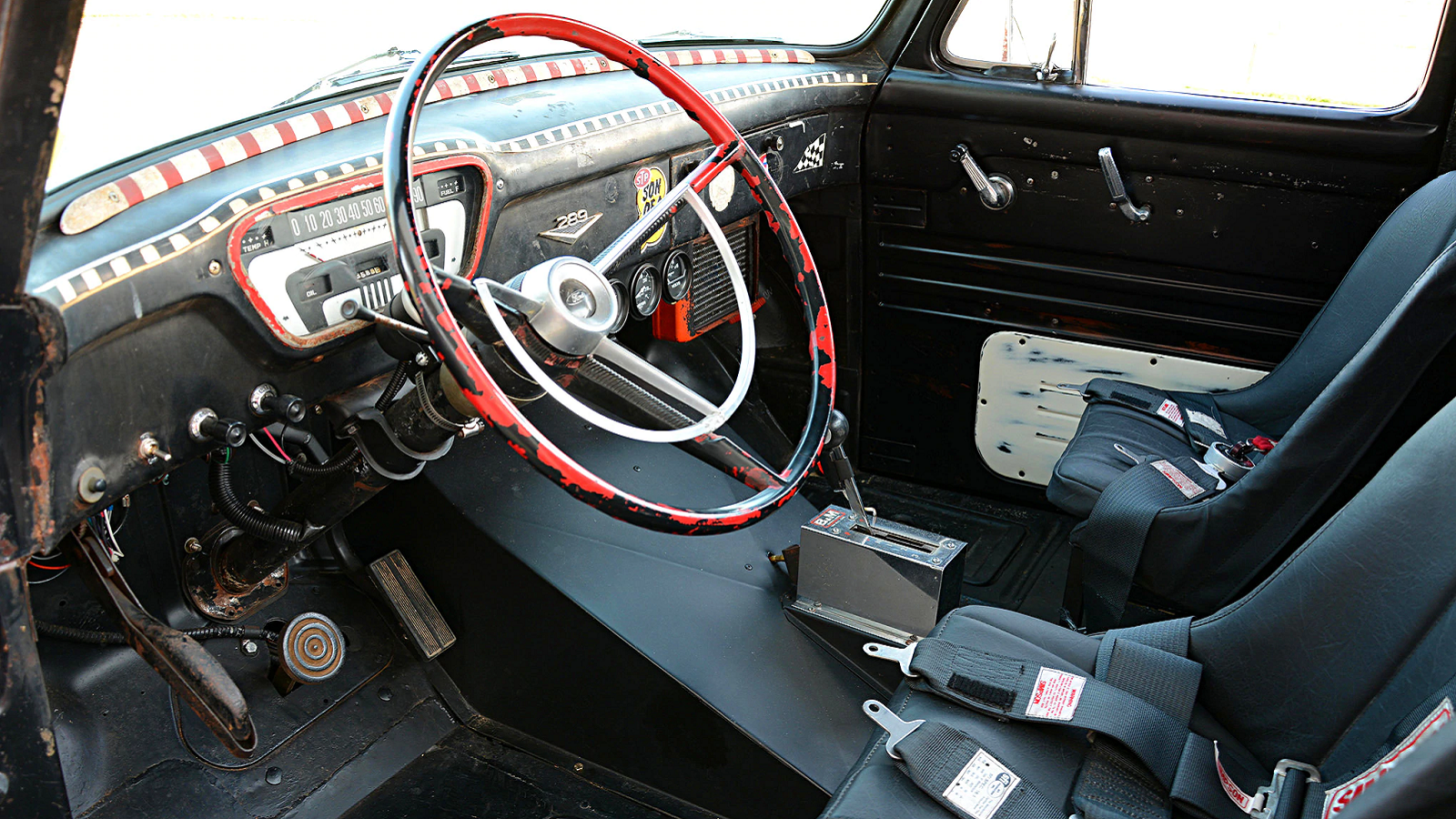 The interior of this truck isn't typical of what you'd find in a hot rod '55, either. For starters, those bucket seats were homemade from a pair of 30-gallon barrels that the Hales duo cut down to fit. They also fashioned a support bar by hand before adding Simpson 5-point harnesses. The finishing touch is a steering column and wheel lifted from a '65 Ford.
