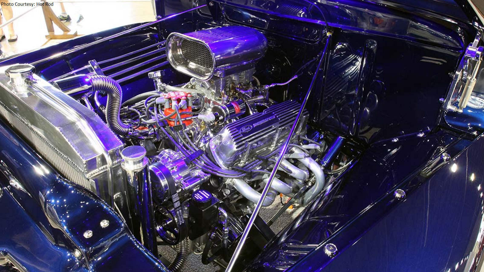 On the outside, the shaved and smoothed body sports molded running boards, a rear roll pan, and frenched antenna. The rear fenders were widened to accommodate huge 20x13 Schott wheels and Mickey Thompson rubber. The stunning paint is a House of Kolor custom mix, laid down by Ben's Custom Paint.