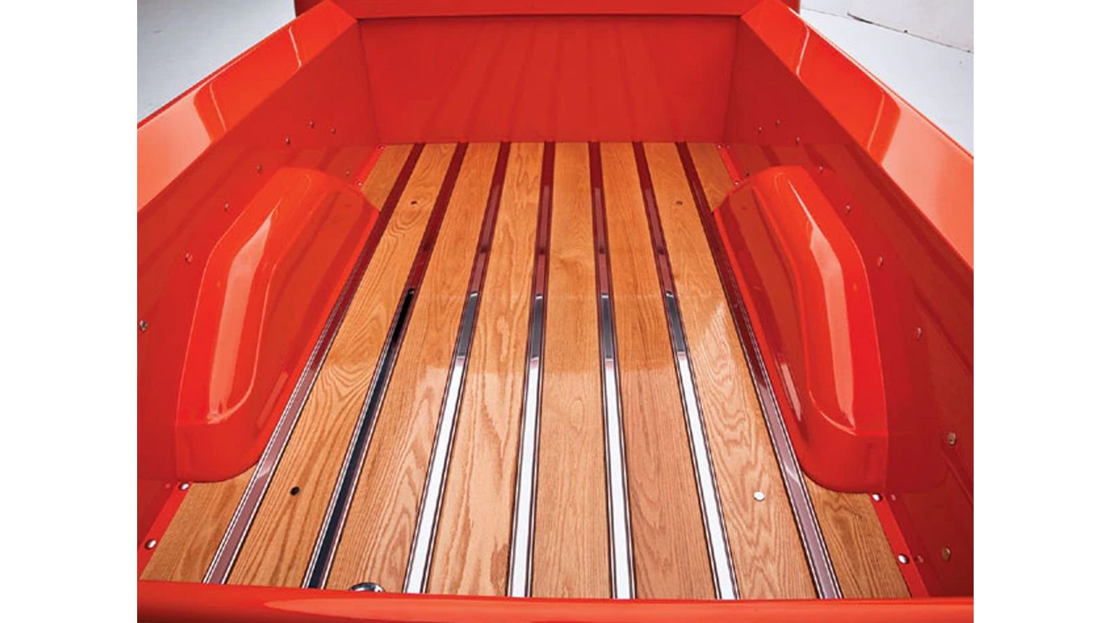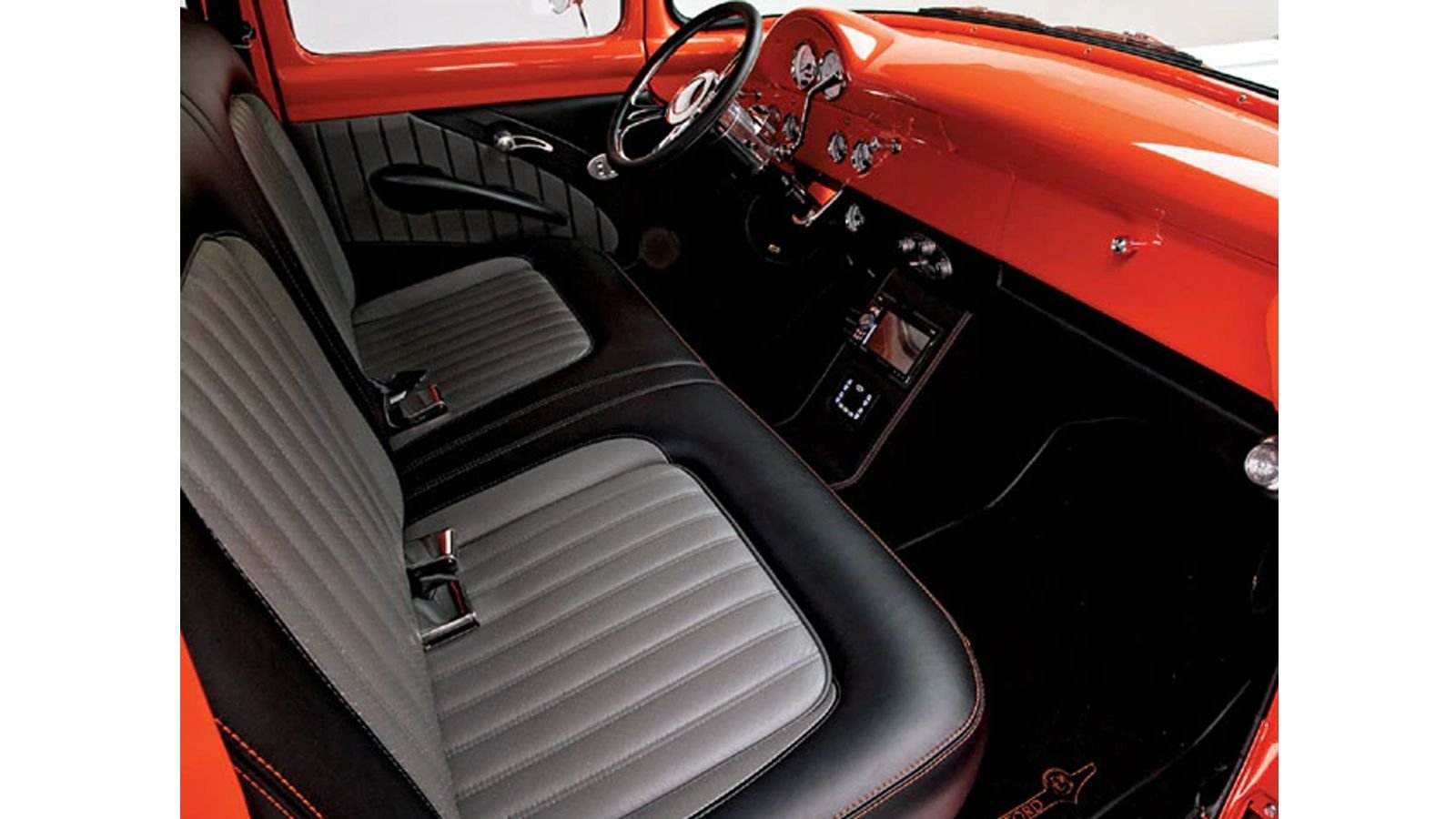 The final stage of the restoration was the interior after all the bodywork and engine rebuild was complete. Custom Stewart Warner gauges adorn the instrument panel and center console. The seats and other interior panels are beautifully reupholstered as well. The two years of work transformed the old truck into this show-ready Ford, which was featured on Truck Trend back in 2008.>>Join the conversation about this Tobasco red classic F-100 right here in the Ford-Trucks forum.