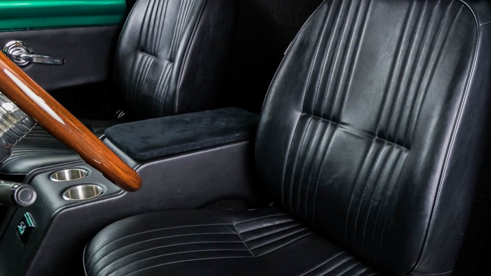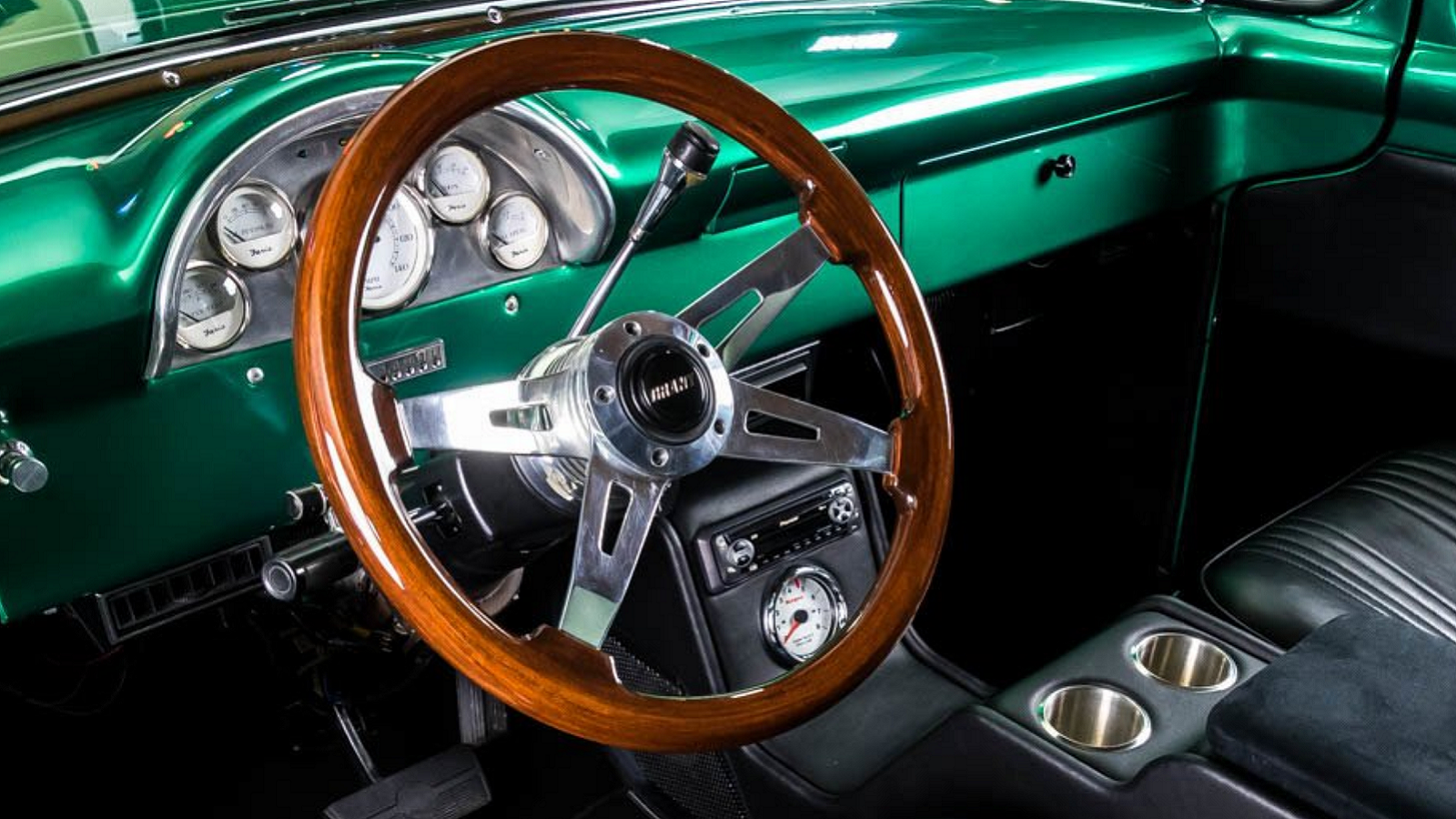 Inside, you'll find plenty of upgrades that make this old Ford a comfy place to sit, too. There's a classic wood-rimmed steering wheel, cozy looking black trim, and a custom center console designed to hold a couple of cold drinks on cruise night.