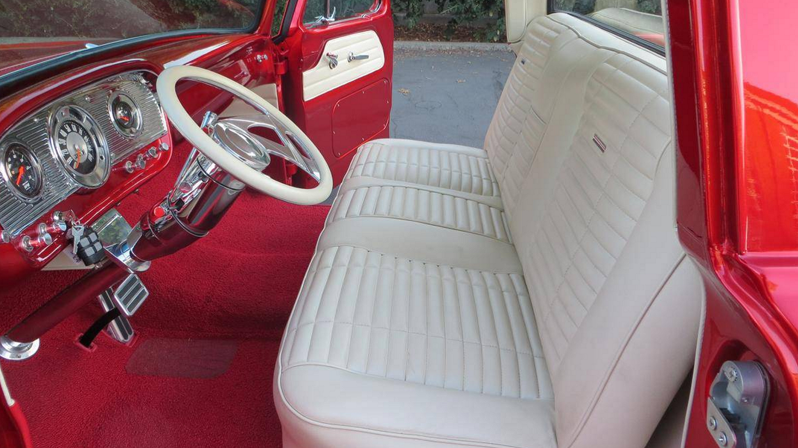The interior of this stunning unibody is equally clean and custom. Tasteful white threads cover the bench seat, door panels, and steering wheel. There's an aftermarket tilt column, gauge cluster, and various other modern amenities that ensure you're riding in comfort as well as style.