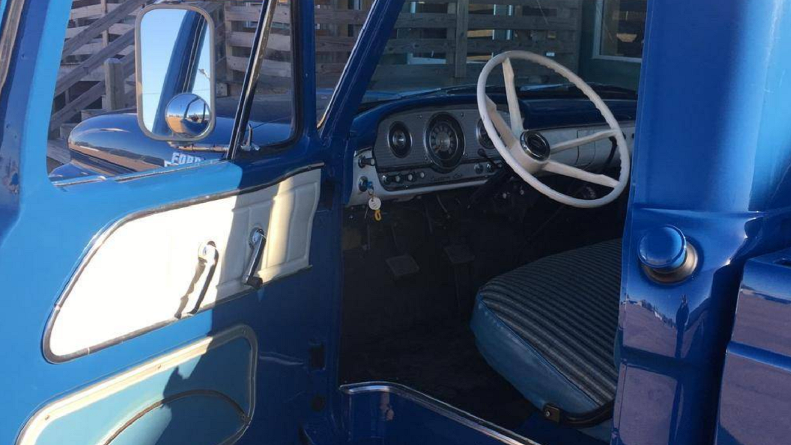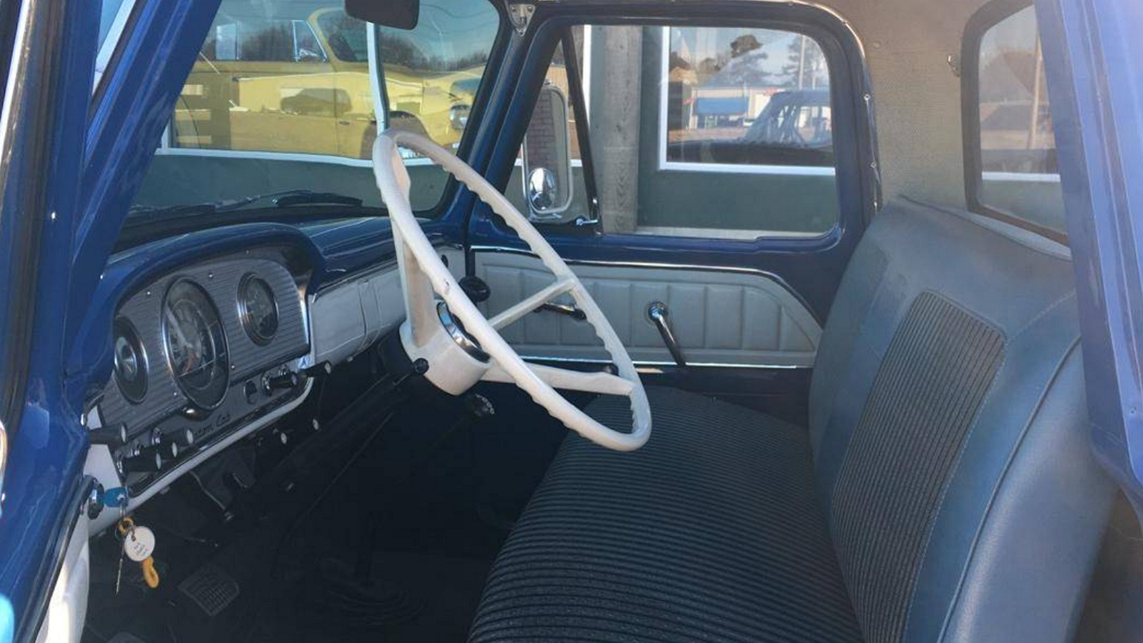 The interior of this '64 is every bit as beautiful as the outside, and it looks to be in mostly original condition. It's also quite attractive with two different shades of blue complementing white hues on the steering wheel, door panels, and various other spots.