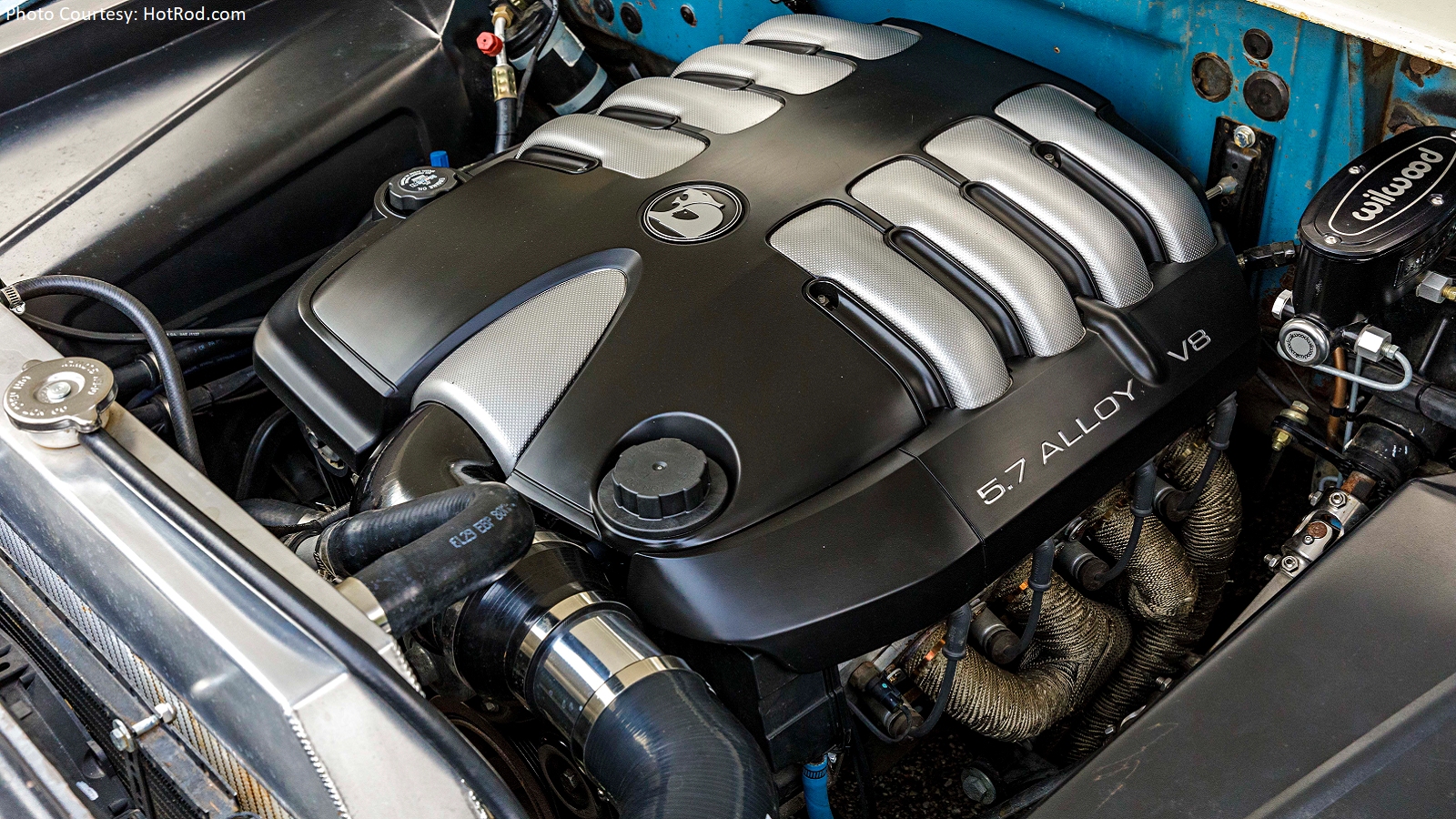We're not fans of Chevy swaps in Fords, but an LS is what Butler envisioned for his powerplant of choice. If nothing else, the 5.3-liter LS and 4L60E tranny probably came dirt cheap. MThe blasphemous build breathes a little easier thanks to American Racing headers and a 2.5-inch stainless steel exhaust.