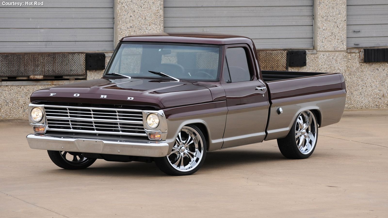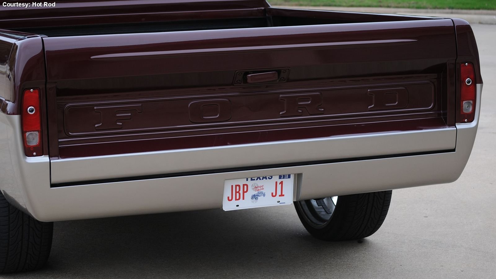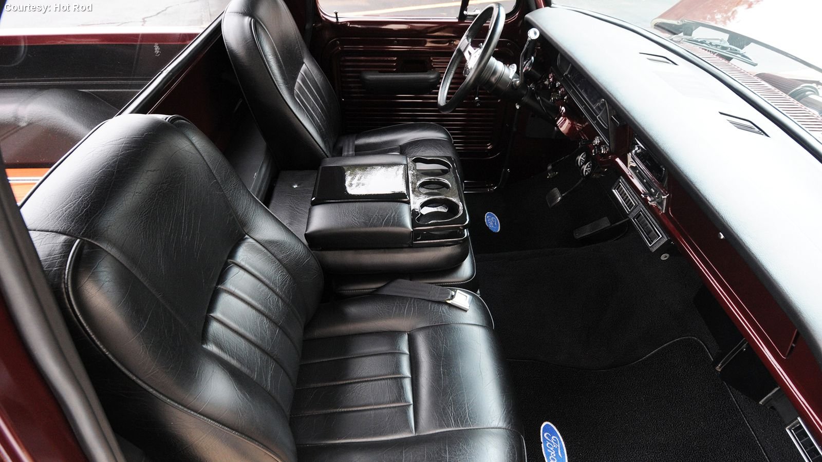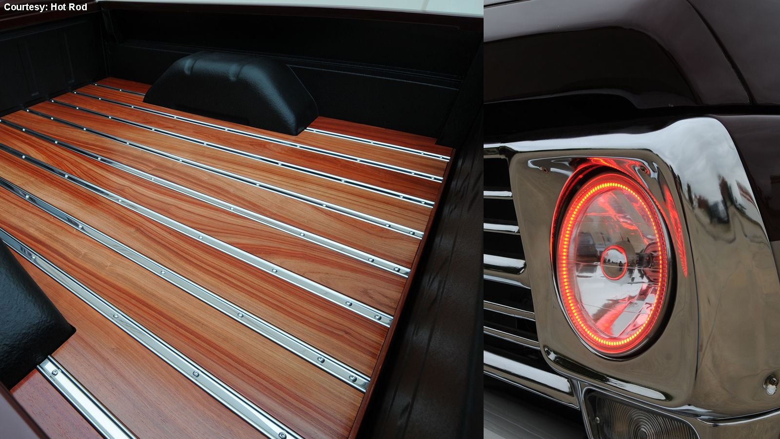 Nowadays a bed isn't a given in a modded truck, but this classic deserved one, and it's hard to find a wood more beautiful than mahogany. The Bed Wood and Parts African mahogany platform was chosen for Werner's F-100 conceal a center-mounted tank from LMC Truck. It looks great next to the R-M Diamont metallic Canyon Red and Pewter paint scheme sprayed by Texas outfit Hollywood Finishes. Th body itself is de-mirrored, de-badged, and de-marker lighted and features an LMC Truck front bumper with built-in fog lamps, and an LMC Truck rear roll pan.