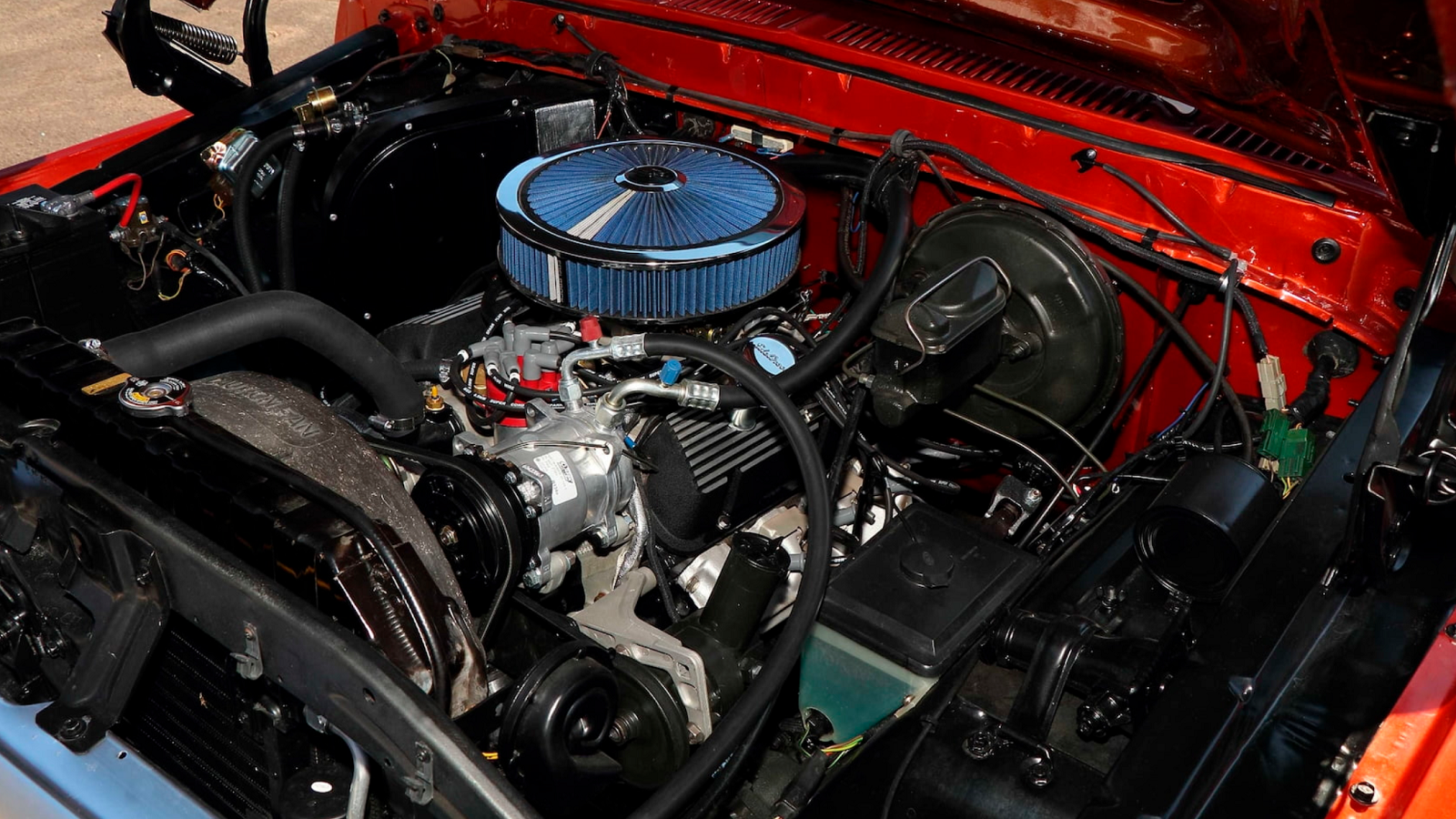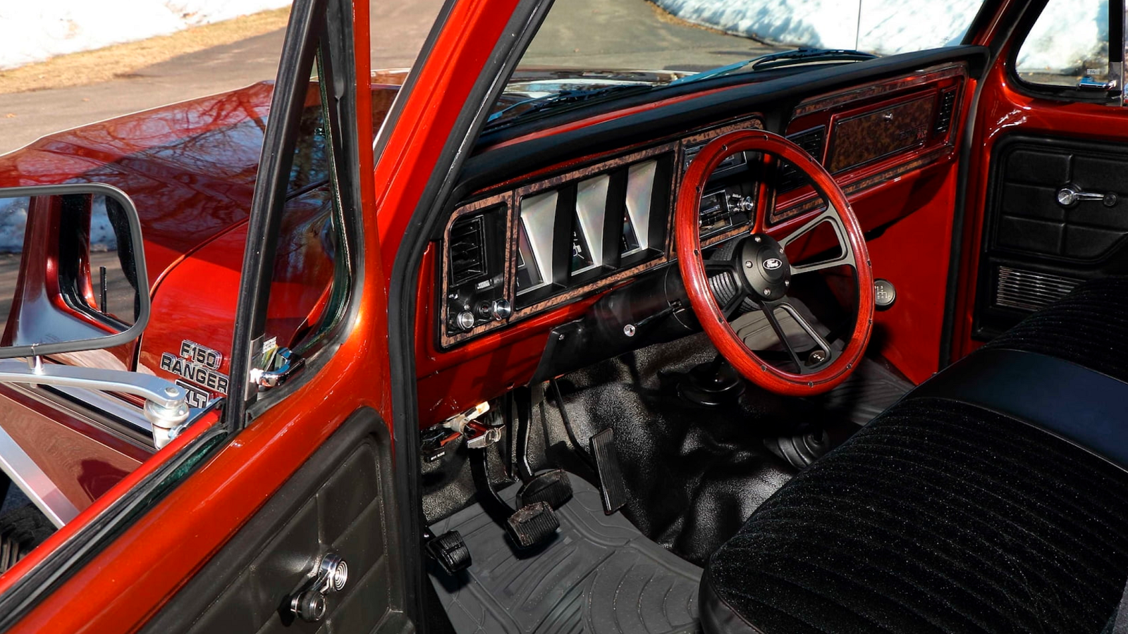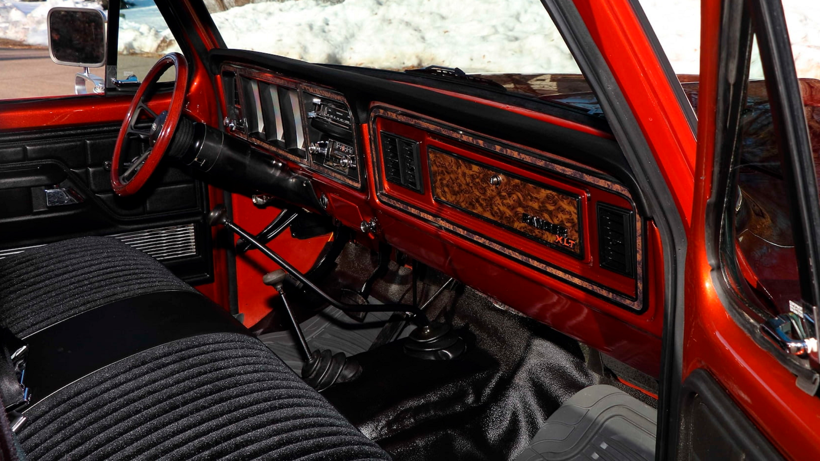 That extends to the interior, which is in fantastic shape as well. Matching Tangerine paint flanks the black bench seat and wood accents, and it all works together quite nicely.