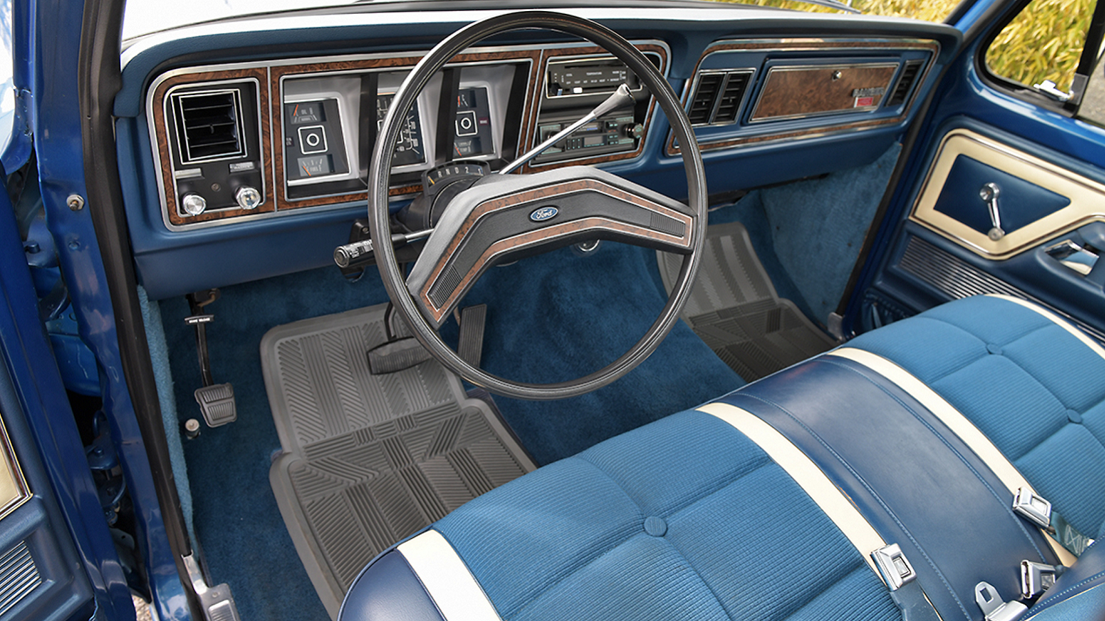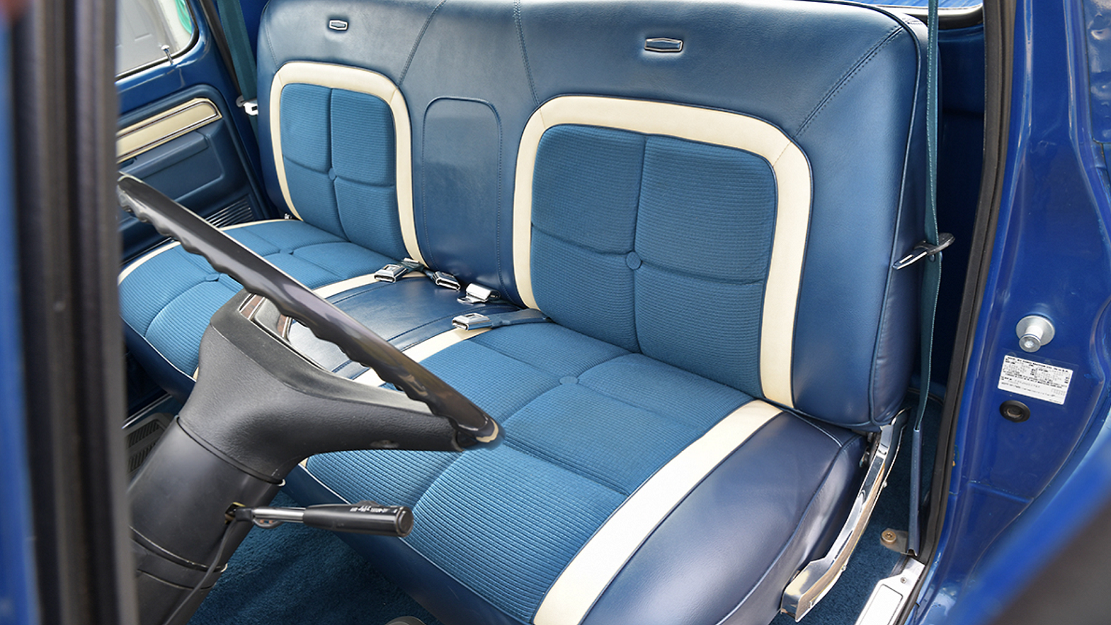 The interior is likewise in excellent condition, with little visible wear. It carries over that blue on blue theme, with some white accents for good measure. According to the seller, the air conditioning works, but the radio and factory temperature gauge are the only things not operational.