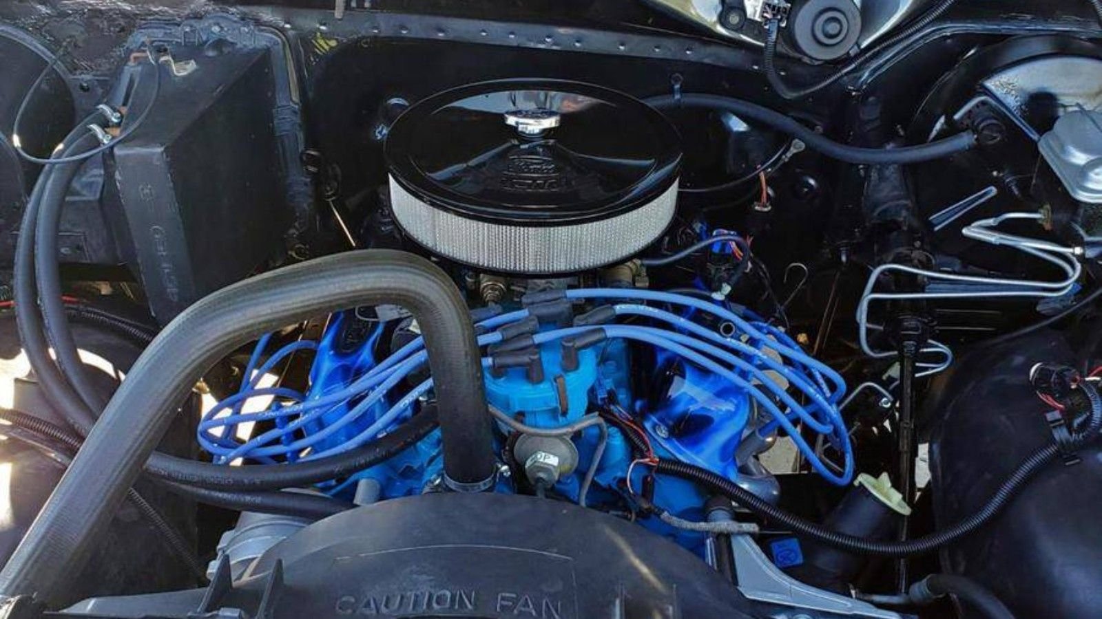 Under the hood, you'll find the original 302 cube V8, albeit an engine and engine bay dressed to the nines. The block has been resprayed in Ford Blue, and it breathes easy thanks to Doug's long-tube headers and a 2.5" Flowmaster exhaust. Other than that, we're assuming that the internals is stock.