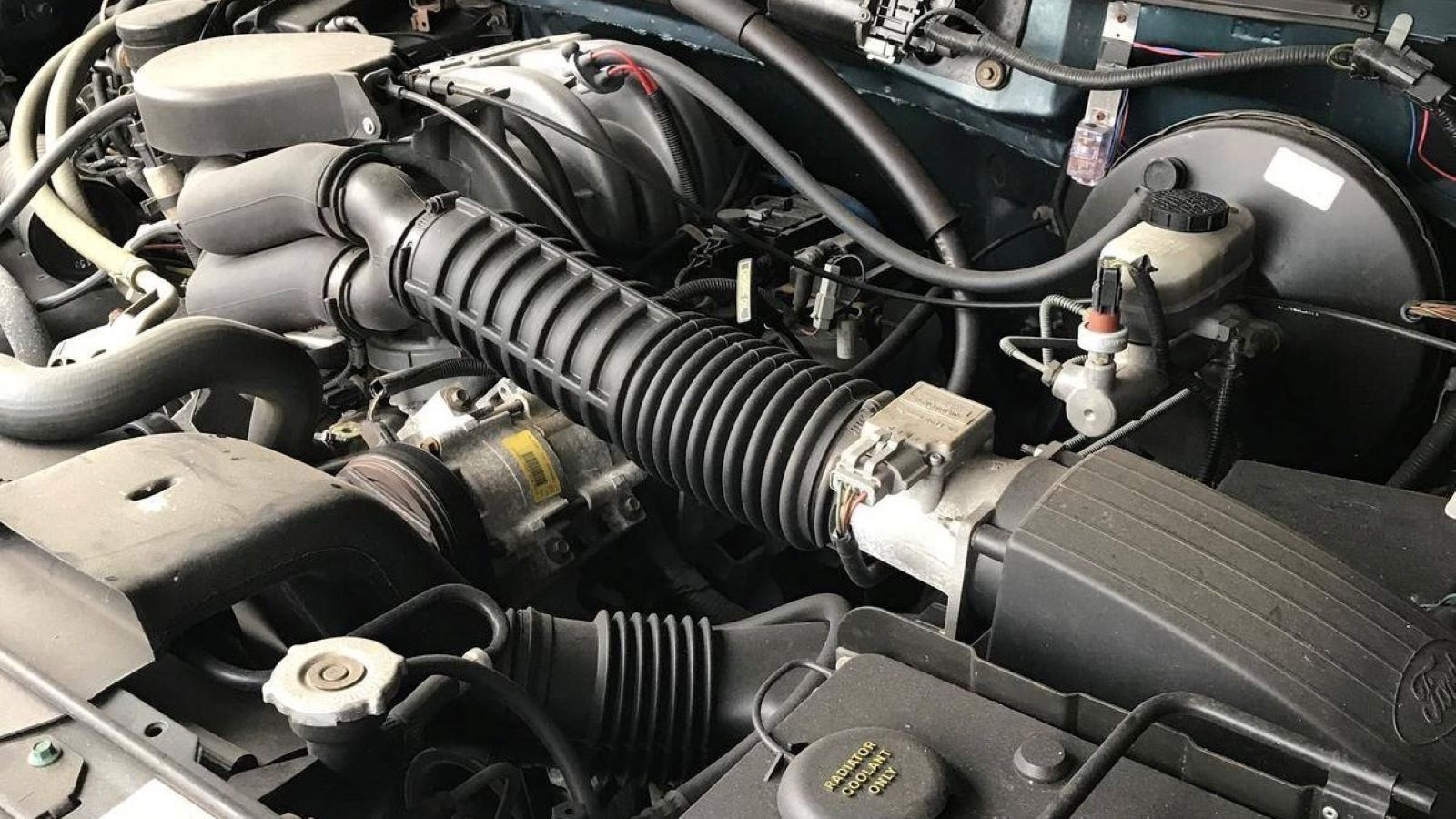Mostly, it could just use a good scrubbing. Especially under the hood, where the original 5.0-liter V8 is a bit dusty from sitting for so long. It's backed up by a four-speed automatic transmission, and the four-wheel-drive SUV is also equipped with a two-speed transfer case and auto-locking hubs for off-road use.