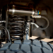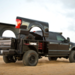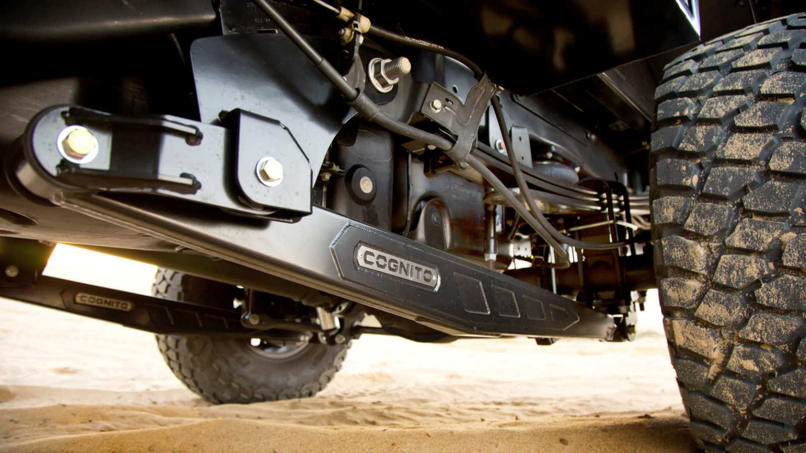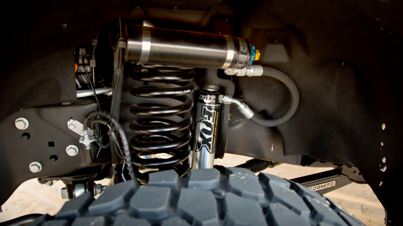 The truck is stabilized by patent-pending SM Series Limited Dynamic Geometry traction bars, in addition to a set of Hellwig brand sway bars and Big Wig’s auto-leveling air-spring system. The system also features QA1 Motorsports Heim joints to complete its robust stability. The truck’s chassis is actually 4-inches wider than a traditional Ford F-250, complete with a pre-runner-style front bumper and custom headlights by the well-known custom parts firm Bullseye Retros.