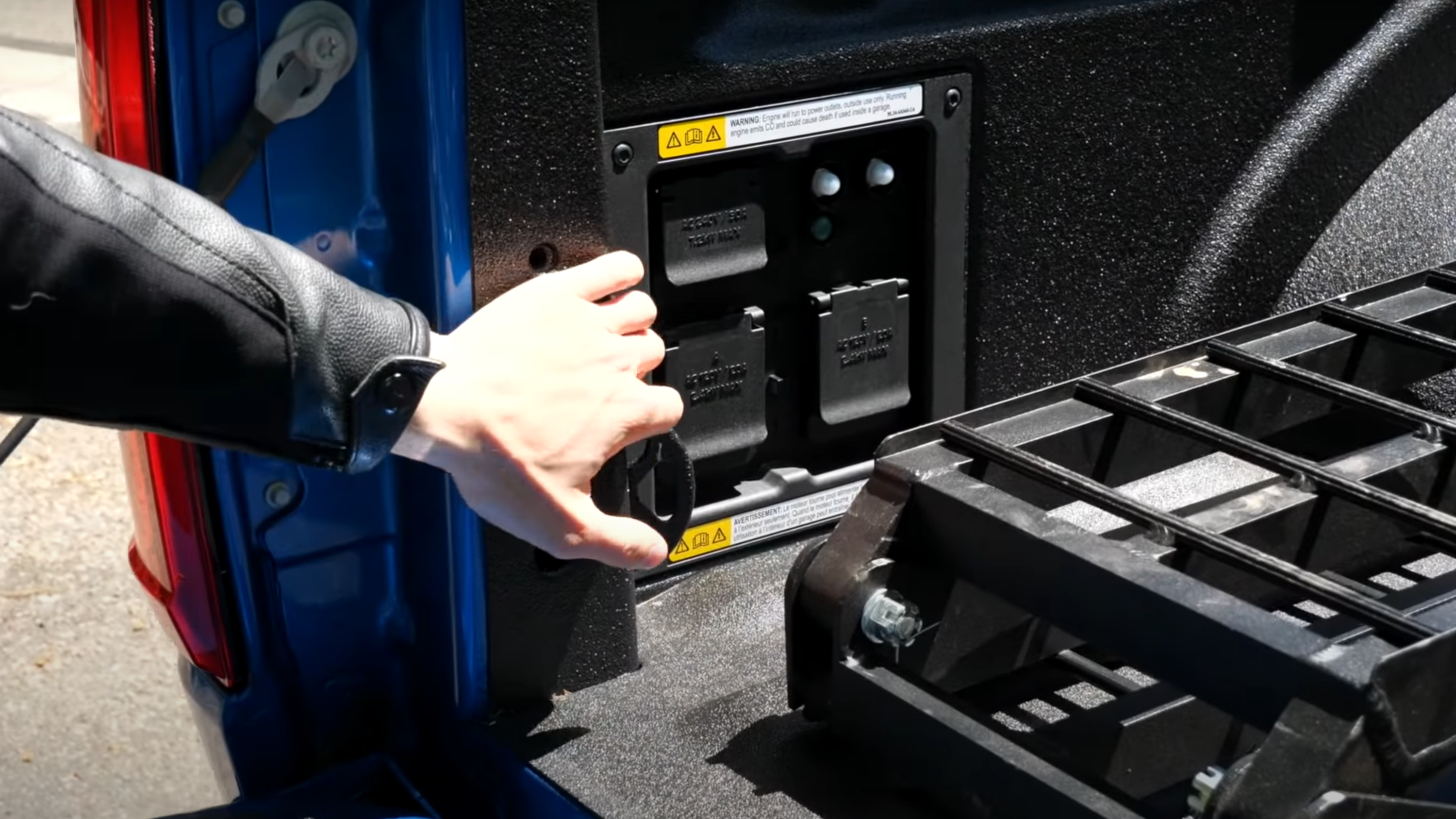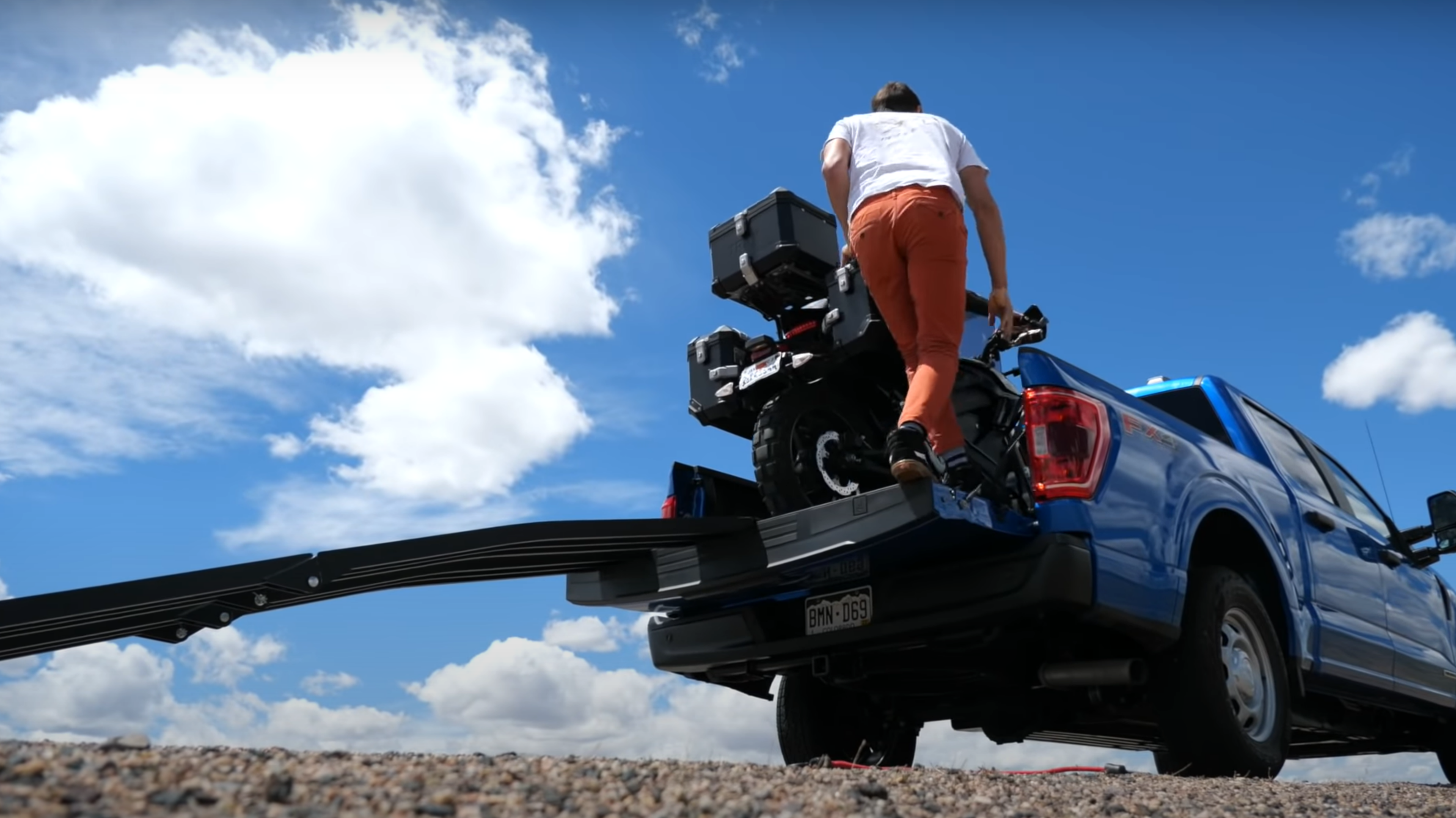 The hybrid F-150 can provide juice for an electric motorcycle on the go.