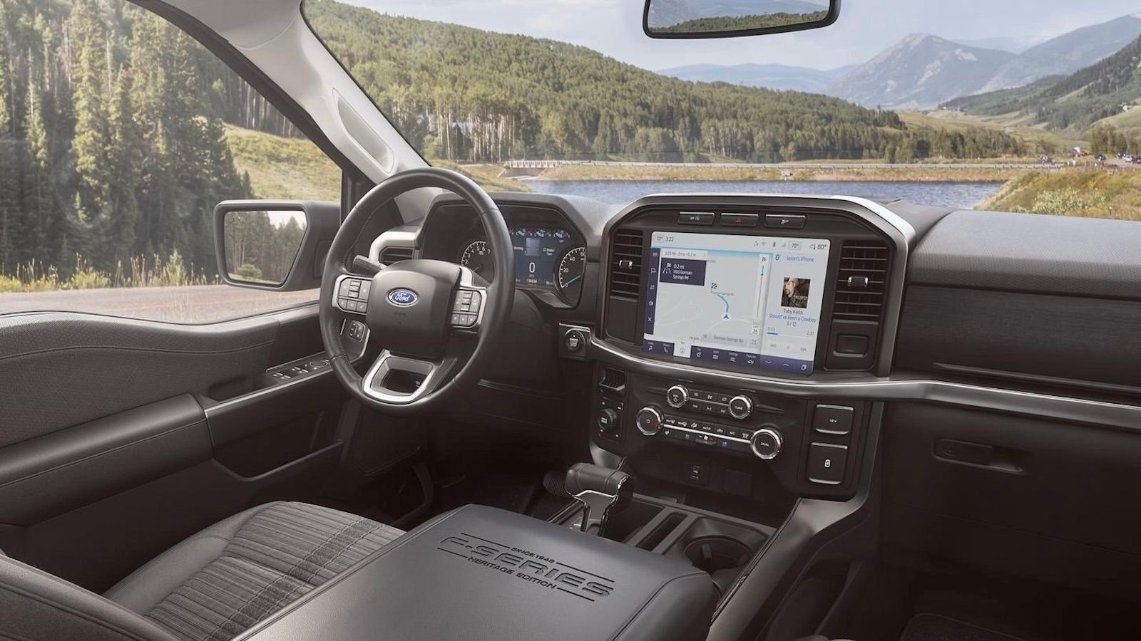 Aside from the exterior paint treatment, the 2023 F-150 Heritage Edition features unique slate gray and black seats, special embossing for the center console and windshield, a "75 Years" logo, and a special animation that appears on the infotainment screen when the truck is started up.