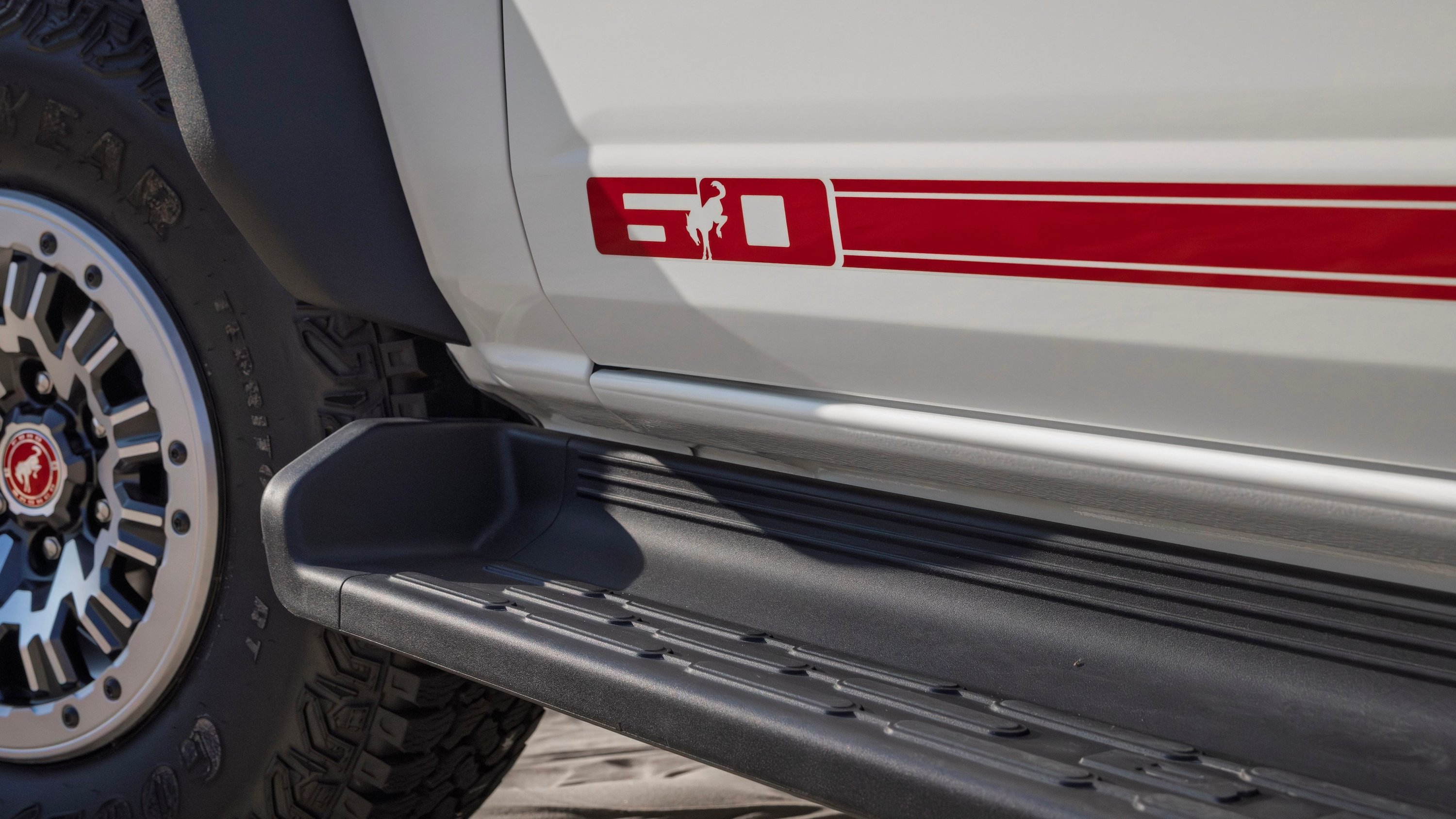 Moving down the sides, we see a Vermilion Red graphic that runs the length of the doors, and features a 60th Anniversary logo near the front with a Bucking Bronco in between those two numbers. A similar stripe was also available on the original Bronco, and we recently saw it present on the 60th Anniversary Mustang package, to boot.