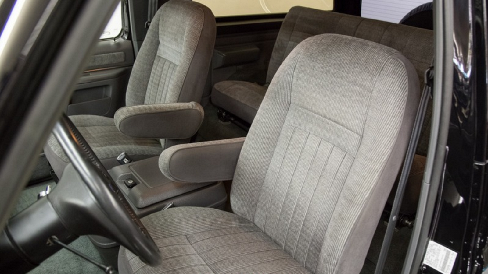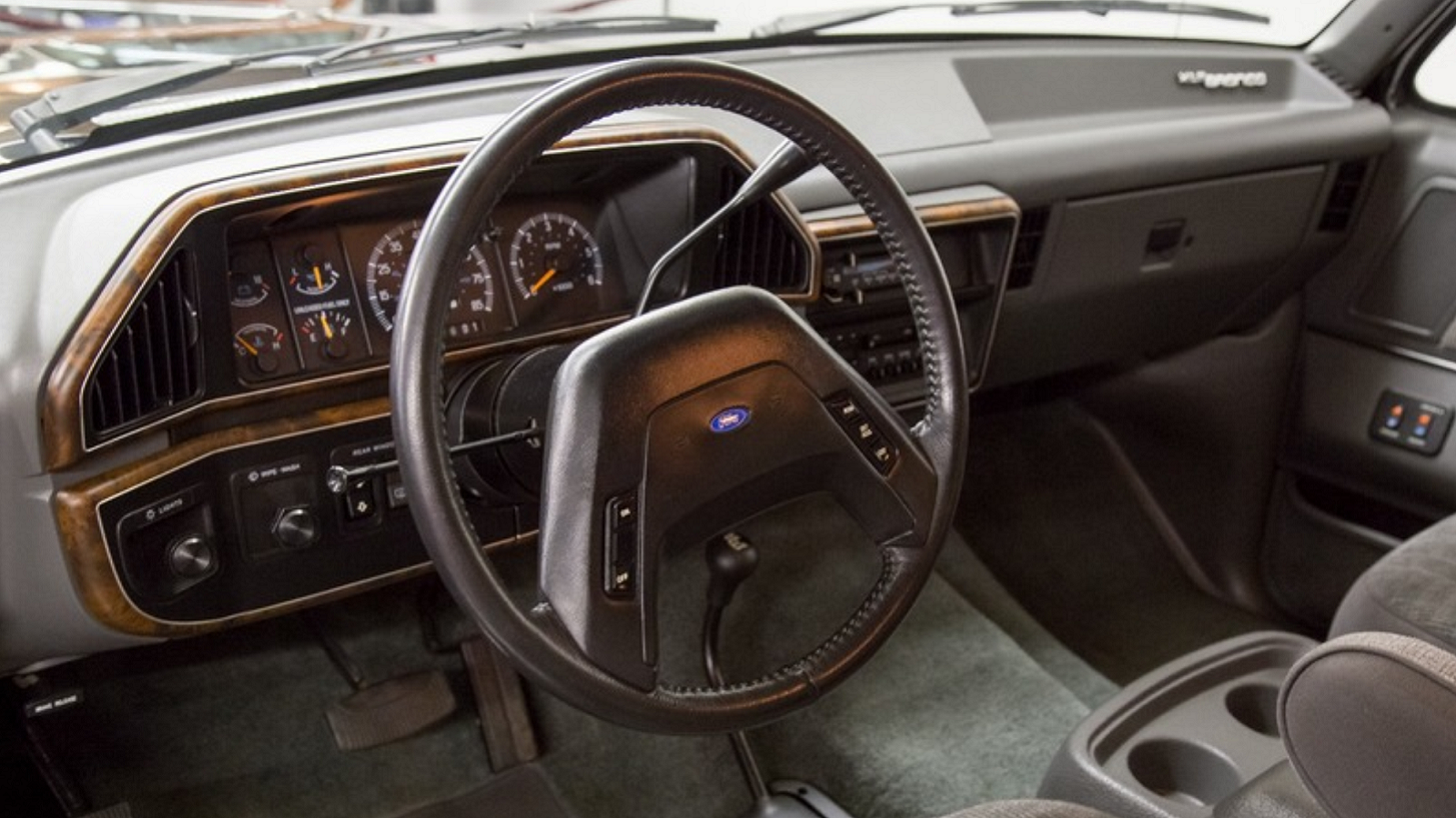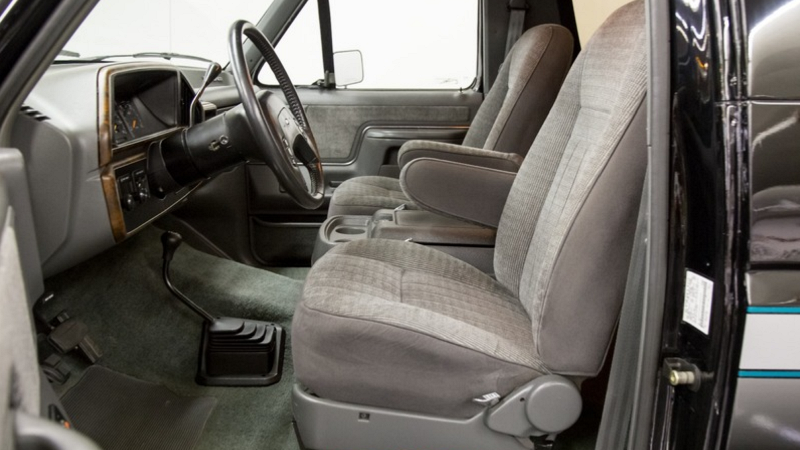 Head to the interior, and the story remains the same. The grey insides of this Bronco look 100% like they just rolled off a Ford assembly line. They're just that incredibly clean. Everything from the carpet to the captain's chairs to the wood look dash trim is absolutely perfect.