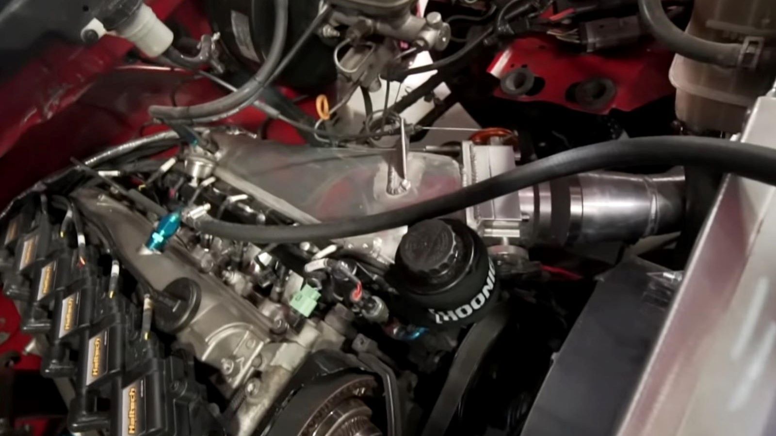 The new engine is cooled by a Mishimoto intercooler and aluminum radiator, while the driver bangs through the gears perched in a Sparco racing seat. The truck has also been fitted with BellTech coilovers that drop it down one-inch and give it more of a menacing appearance to boot.