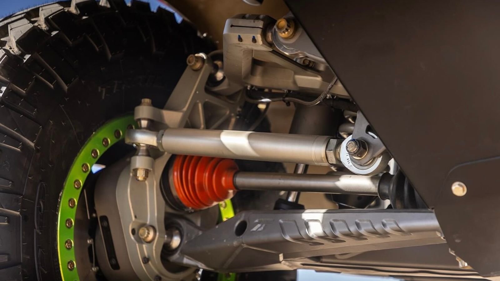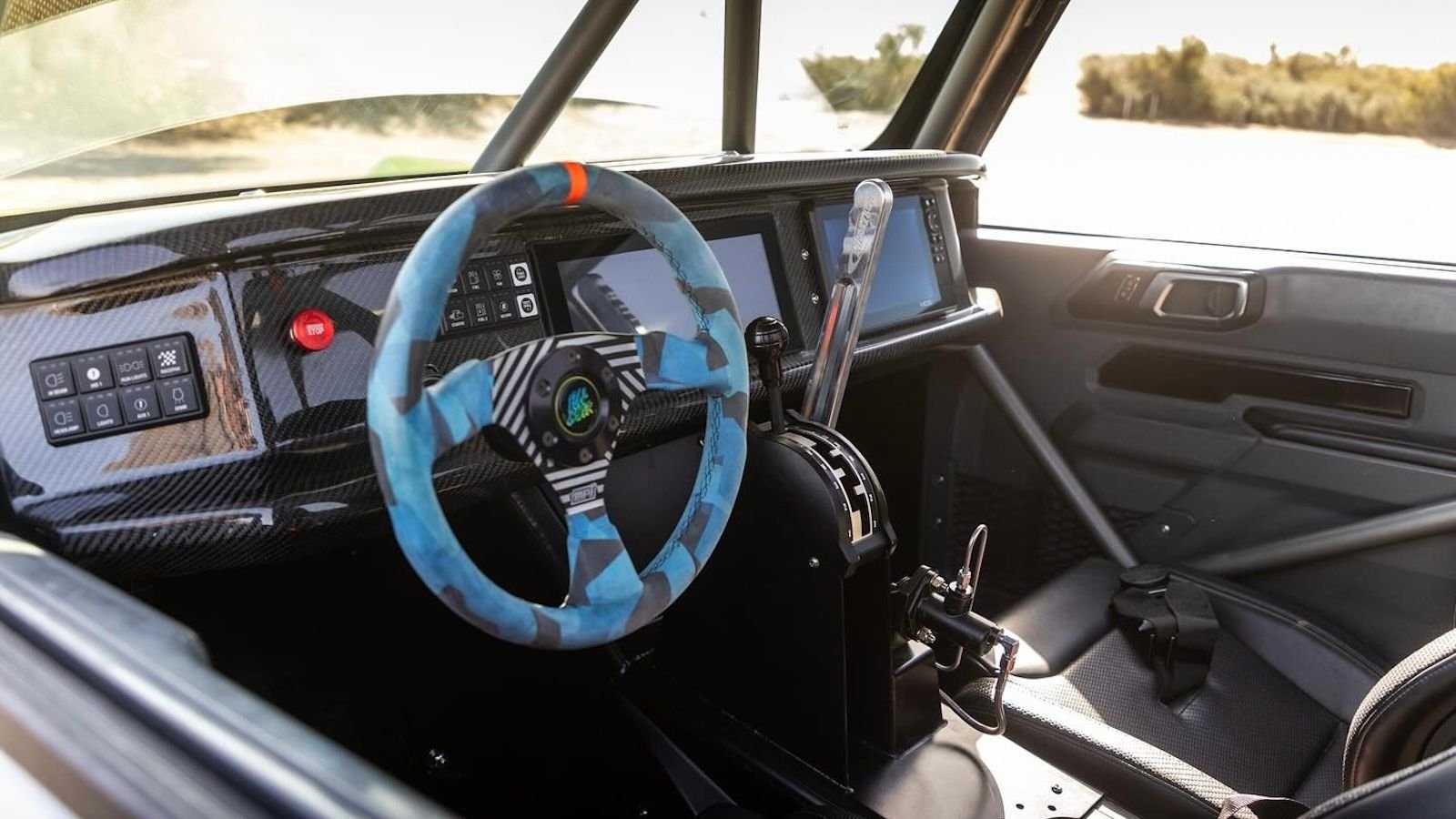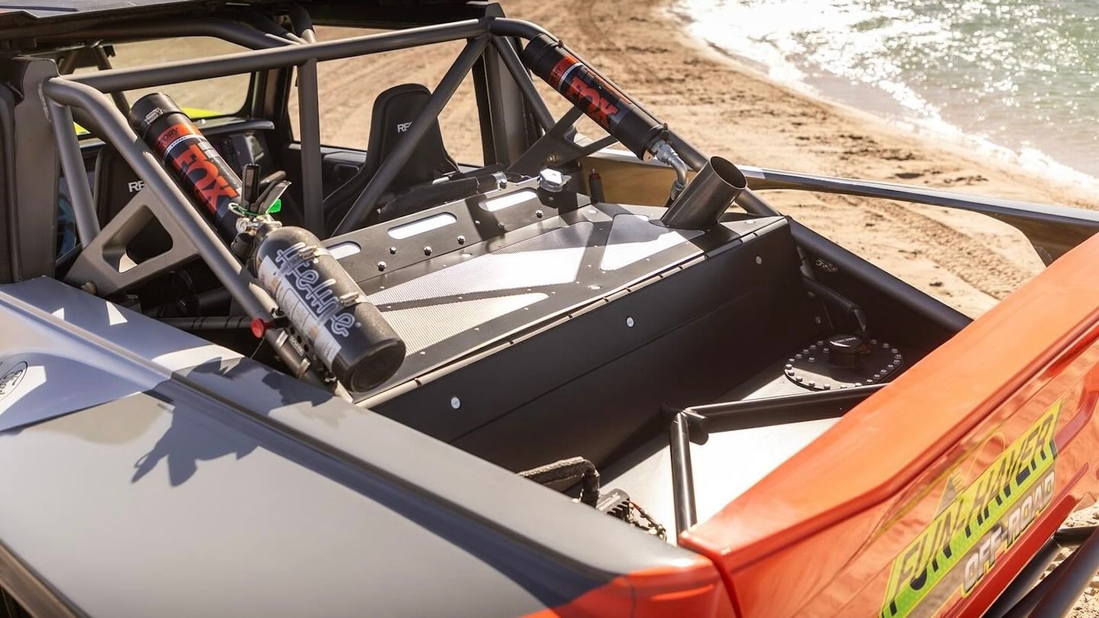 From there, Gittin Jr. ditched all the stock body panels and replaced them with custom pieces that mimic the look of the Ultra4 Bronco racers. Only the original cab remains, in fact, and the whole thing rolls on a set of beadlock wheels wrapped with massive 40-inch tires.