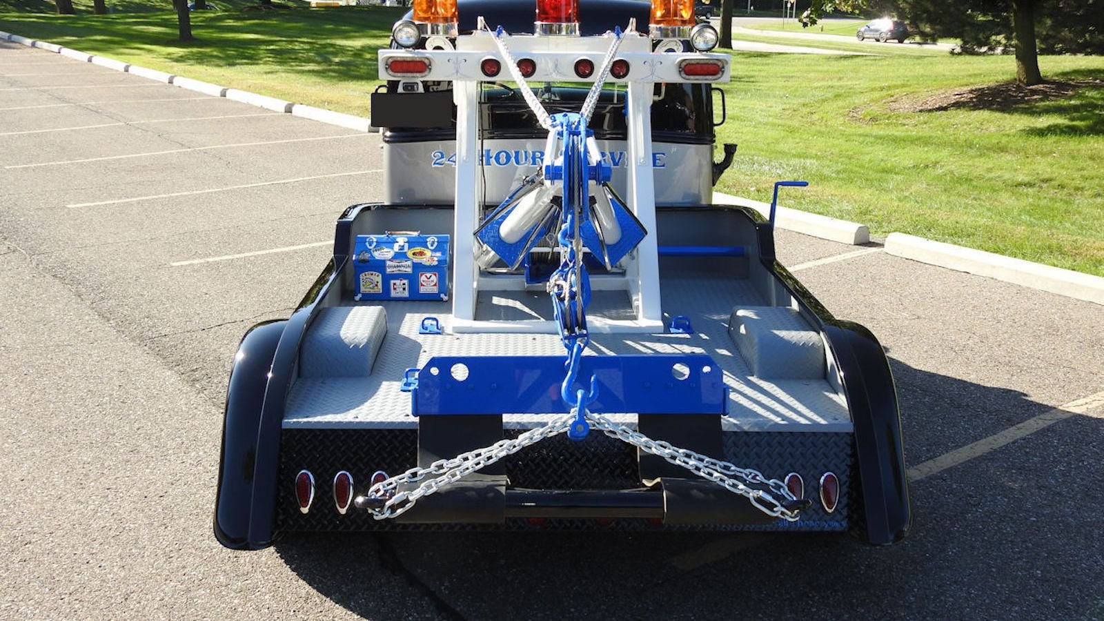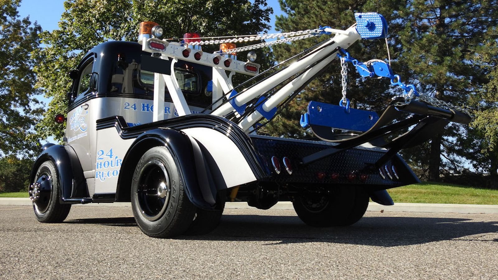 Outside, the truck's array of chrome steel plays beautifully off its black base coat which is abutted by a muted silver body color and vintage-styled, royal blue texts that reads "Happy Hooker Wrecker Service" and "24 Hour Recovery." The truck's blue accents continue in the back with royal blue trim on the towing apparatus.