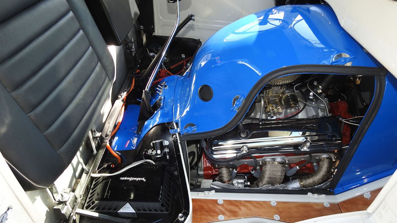 The first Ford COE truck debuted in 1938. The impetus of Ford truck designers was to increase payload space without violating newly implement vehicle length restrictions. A bright blue bulb marks the centerpiece of this remade 1947's bright cabin, one that's brilliantly illuminated thanks to a white steel interior and two retractable front windshield panels to let in a spring breeze.