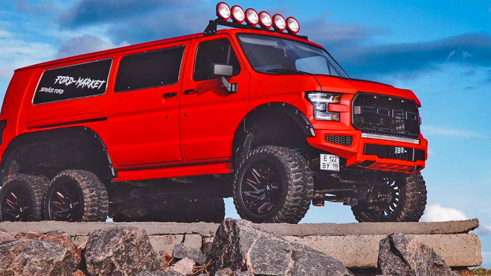 The folks at Ford-Market started by adding a nice lift to the van at first. But as cool as a van with a decent lift might look, that wasn't quite enough to satisfy the Russian shop in their quest to create a super van. Before long, a third row of wheels was added to the build. And to give the van a look that matches its personality, they also decided to give the Ford a new fascia.