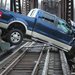 Well, someone needs to address the elephant in the room; how? It doesn't seem like this railroad is on a street, in fact, there is water on both sides of it, so how did this flying Ford truck get there? Before we start brainstorming ideas, did someone tell the railroad operator about this?