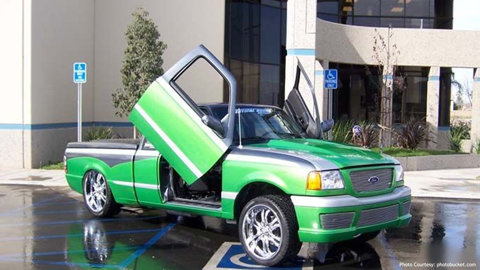 These doors don't make the Ranger any closer to the Lamborghini, nor does it make it cooler. There is something about combining a characteristic from a sports car and putting it on a truck that never makes sense. Maybe the candy green color could've been OK by itself, but when mixed with the shiny rims and the doors, it's safe to say it ruined a perfectly good Ford Ranger.