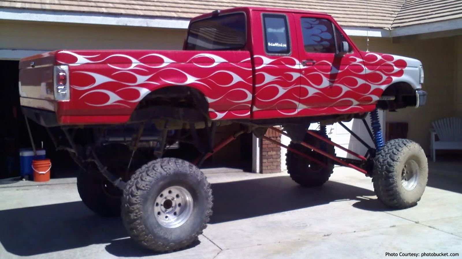 We are not against the massive lift, and even though it may be an overkill, we can all appreciate a monster truck, but the flames all over the body will catch your eyes well before the lift does. There is something about the normal red color, with the bondo-colored flames, and the blue shocks that make this truck a no-no.