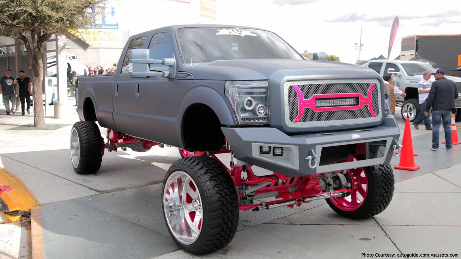 This truck was part of the 10 worst trucks at SEMA. The unfortunate thing about this truck is that it has one of the nicest paint jobs ever seen on a Ford, and it is unfortunate because we never though a small pink accent on a grille can ruin a whole paint job that quickly; the rims don't help either, they are horrible.