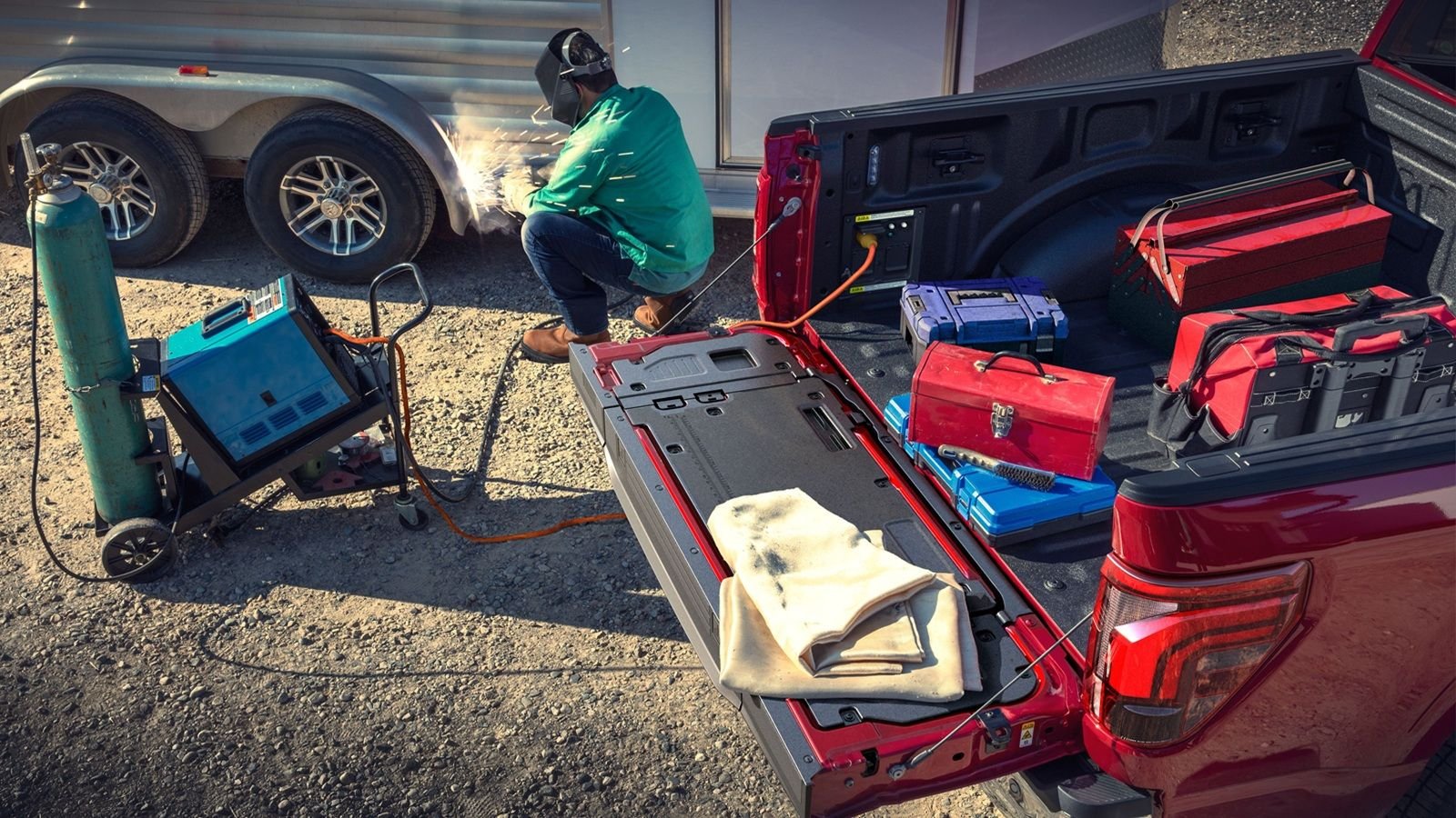 This isn’t quite the tailgate, but it’s close enough. And you have to use the tailgate to access Pro Power Onboard, so we are counting it. The system turns your truck into a mobile power source with various levels of power output depending on your truck model and configuration. In the most powerful form, it can provide up to 9.6 kW of power. Enough to power a couple of power saws, an air compressor, a belt sander, and more. Power up your jobsite or campsite right from the back of your Ford truck.