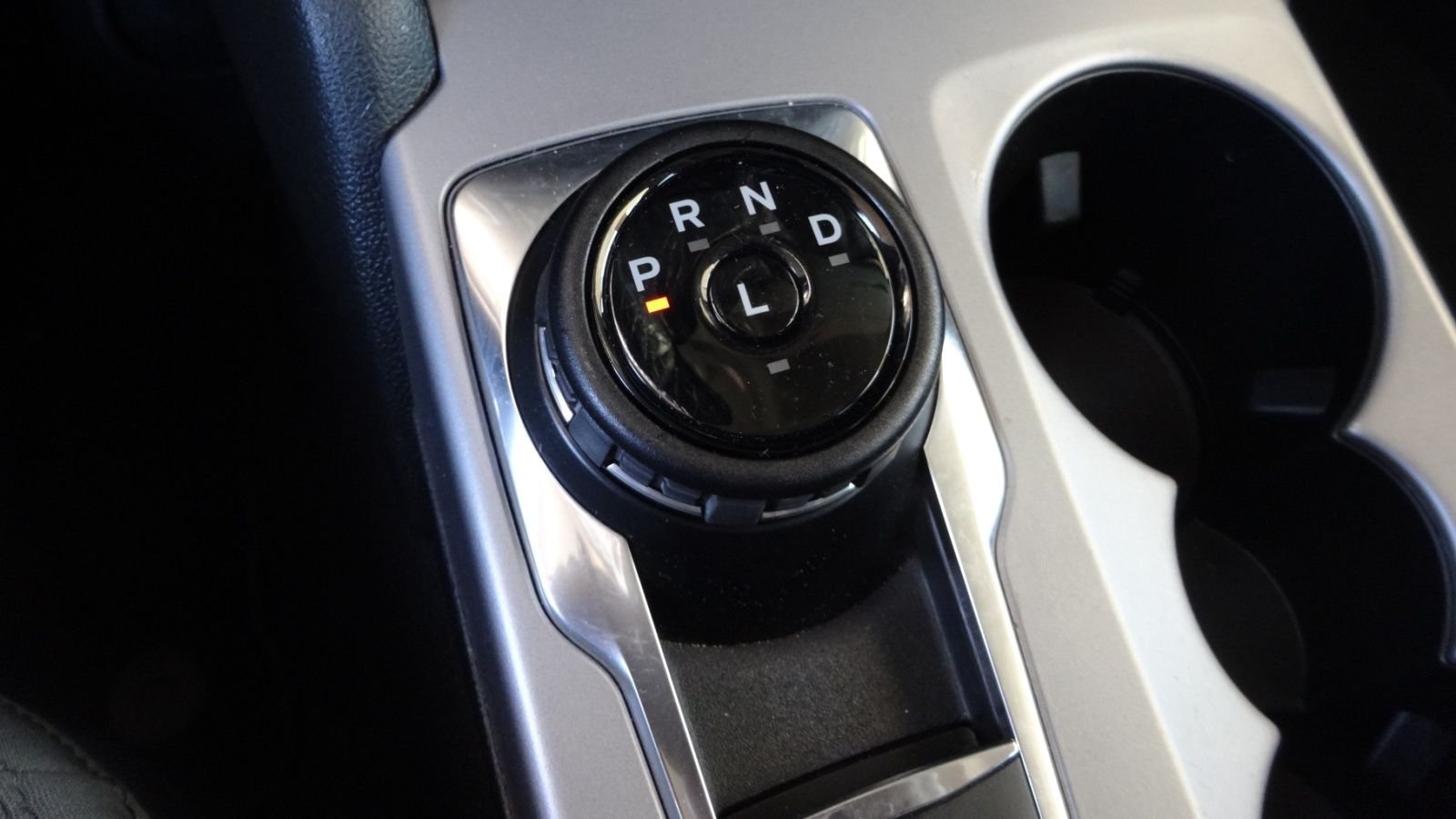 Instead of the old obsolete stick shifter design that takes up space, we select gears by turning this round knob. It is a better way to go. It takes up no room and automatically goes into PARK when the engine is shut off.