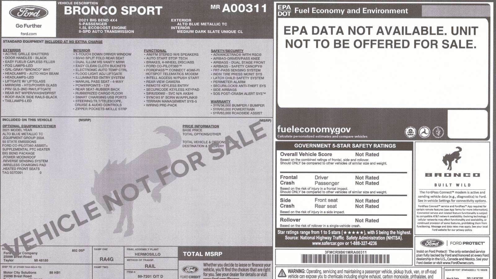 This Bronco was not for sale, so did not have a pricing numbers. But the base fee starts at $28,160. This example was charged $395 for the blue metallic paint, and $795 for Co-Pilot360 assist package. Last was the Big Bend option. For your $1,595 we get heated mirrors, fog lamps, keyless entry, auto climate control, and rubber floor mats. Total tab came to $32,440. A heavy duty "Badlands" package issues the larger engine, a better AWD system with locking differential and larger tires. It is estimated to start about $37,000.