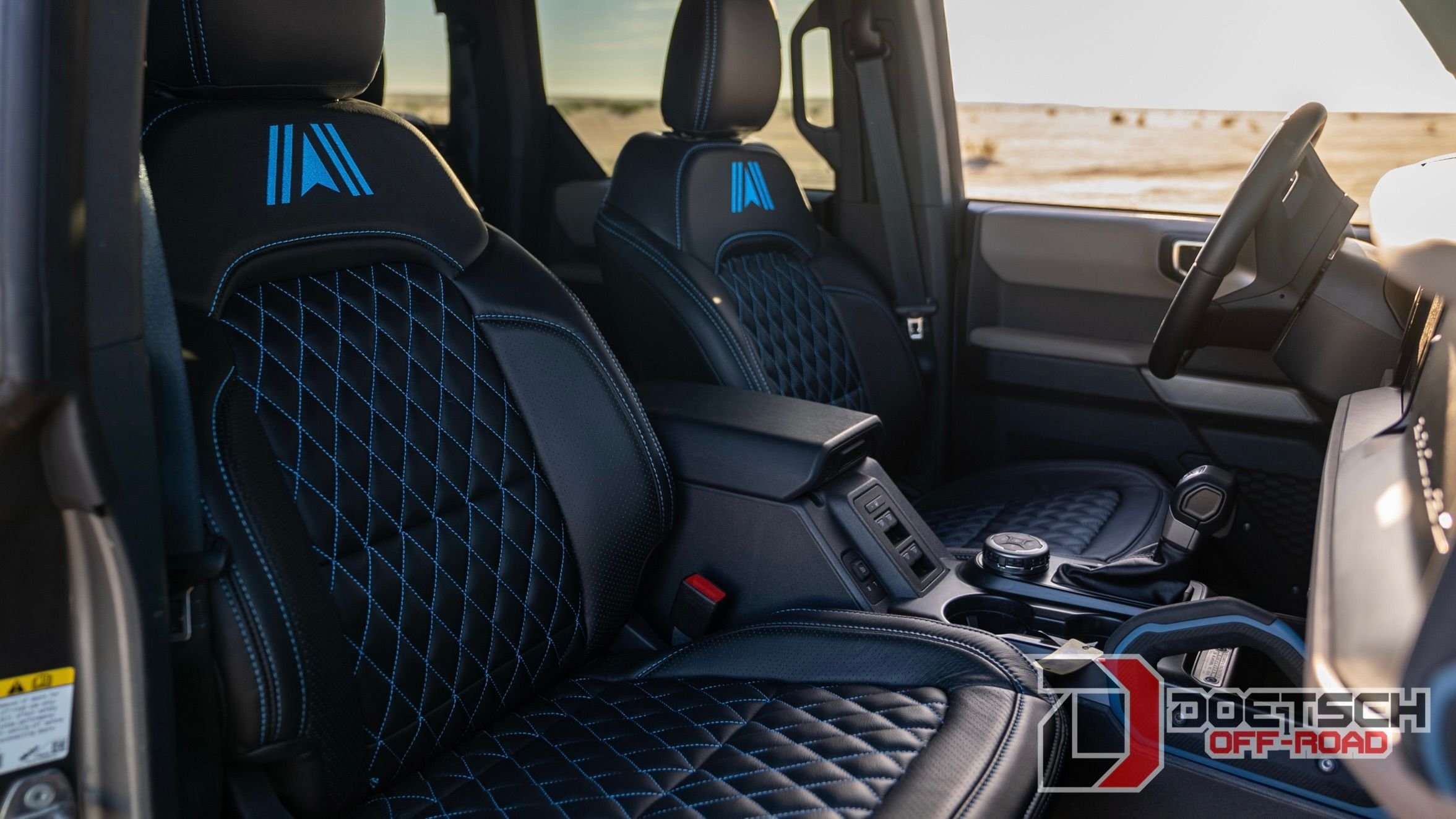 The finishing touch here is a totally redone cabin with a Katzkin leather upgrade, giving this Bronco some luxury vehicle-like diamond stitched seats that look rather comfy to sit in - whether you're on pavement or far from it.