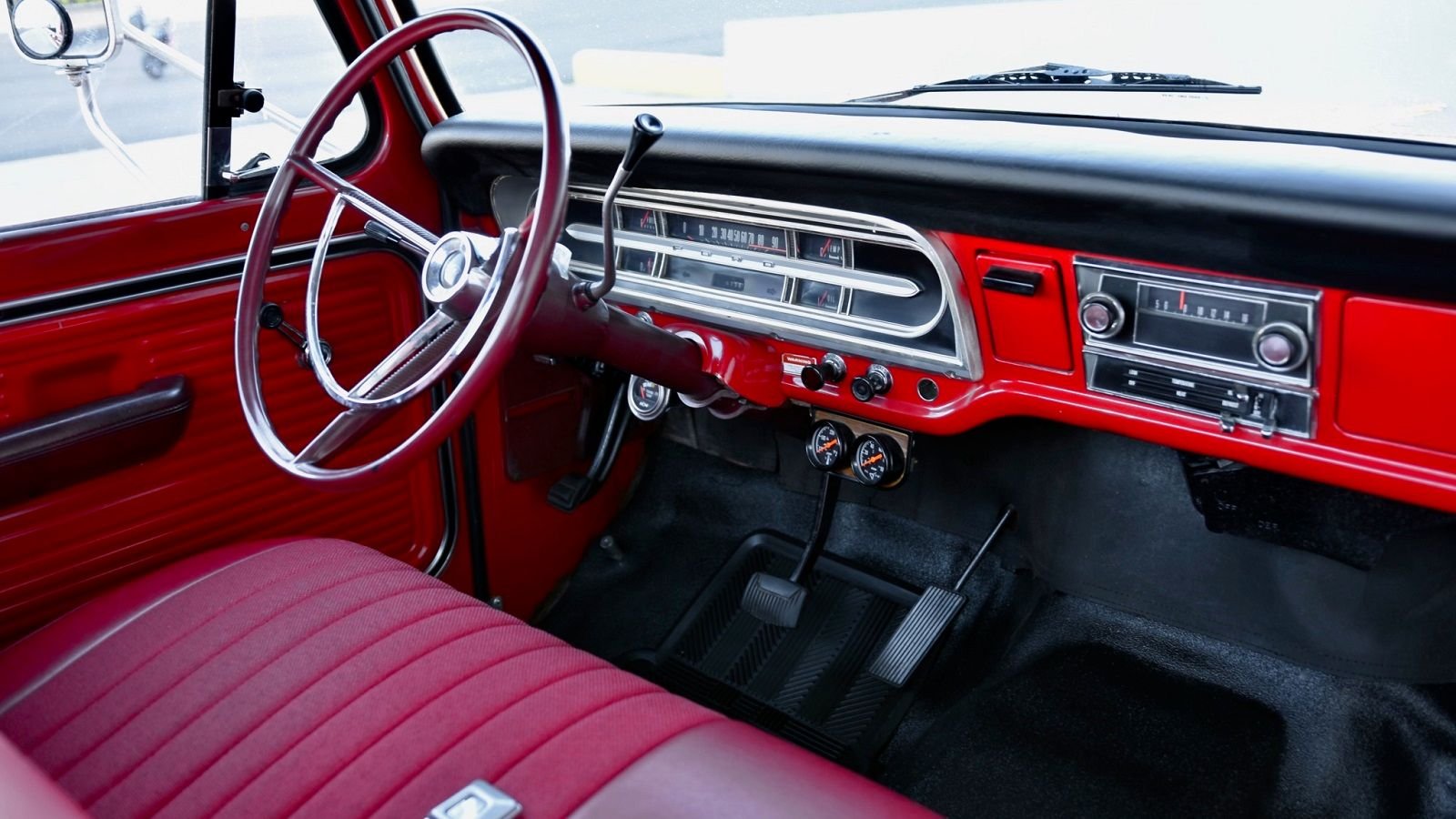 The inside of this classic Ford sure looks like a pleasant place to spend a few hours, too. The requisite vinyl bench seat isn't as uncomfortable as you might think, though you will feel some drivetrain heat soaking through the rubber mat-laden floor. But hey, just think of it as a built-in foot warmer.