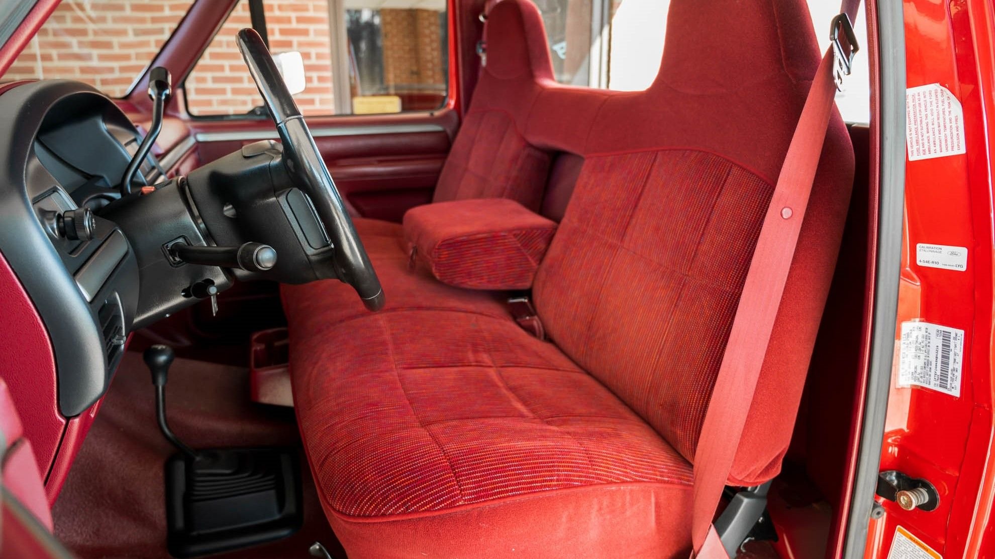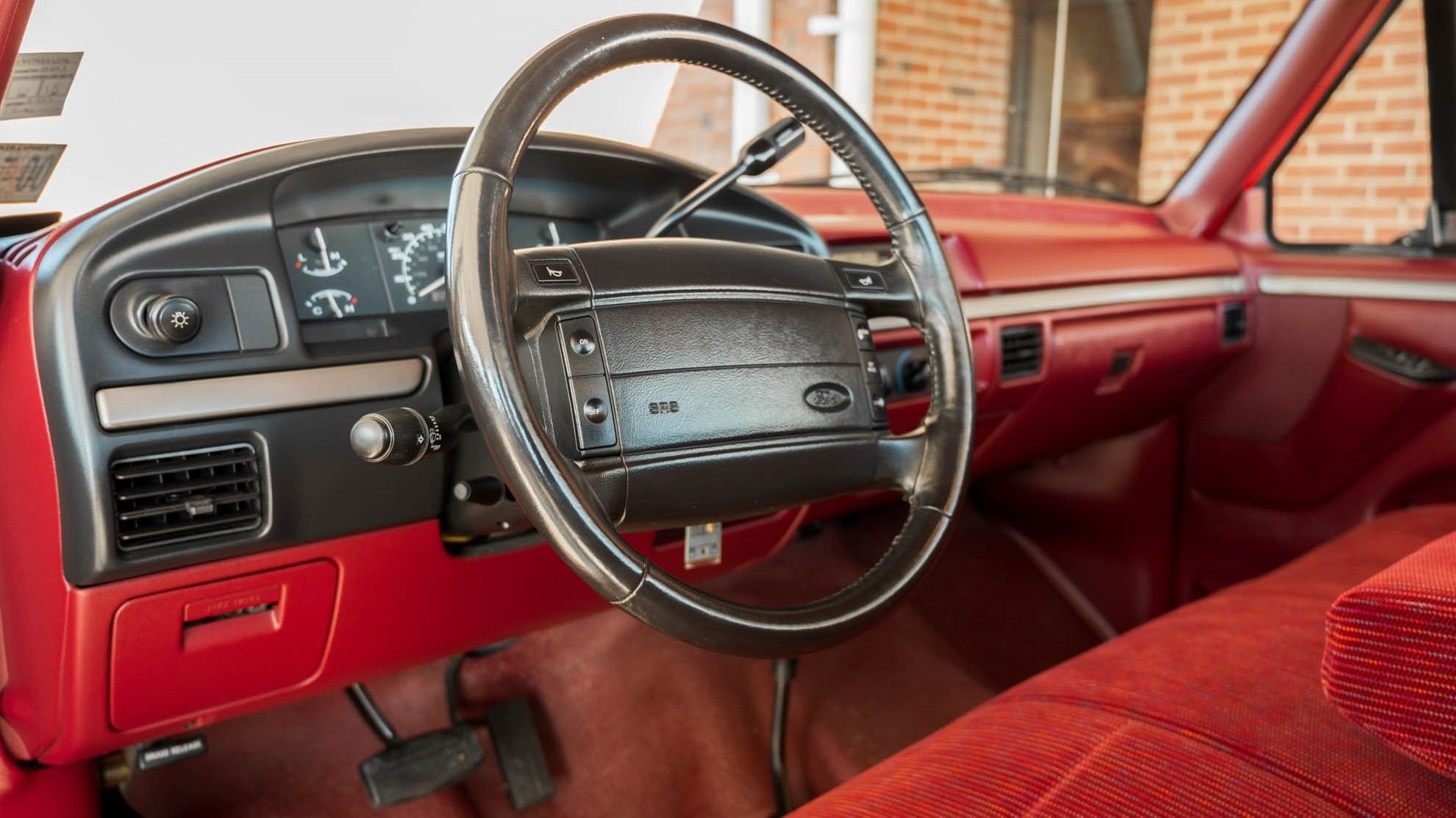 The matching red interior is also in amazing, factory fresh condition. Everything we remember about these pickups is present, including that cloth-covered bench seat, with a few black accents to break up the sea of red. This well-equipped XLT also sports power windows and locks, air conditioning, cruise control, and a cassette stereo.
