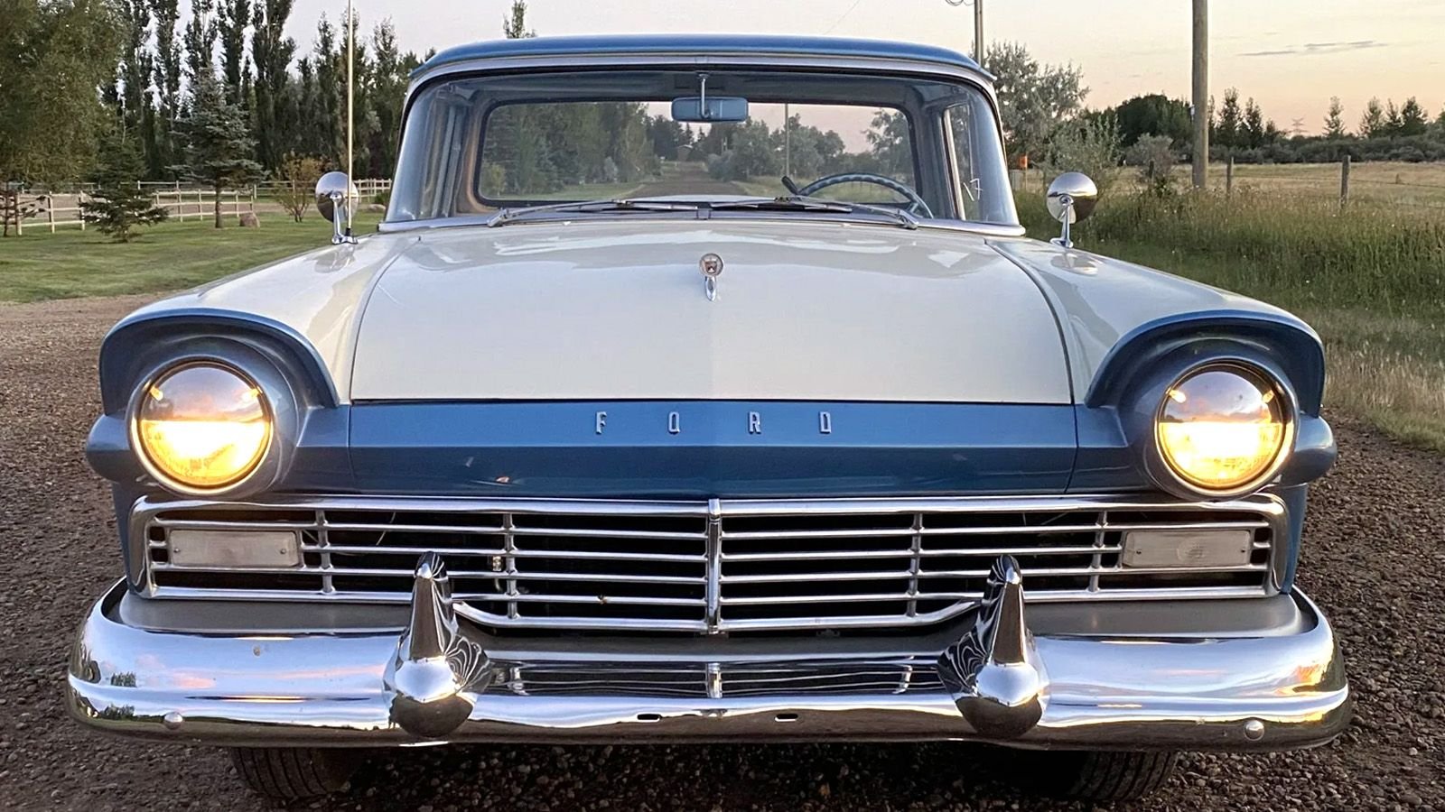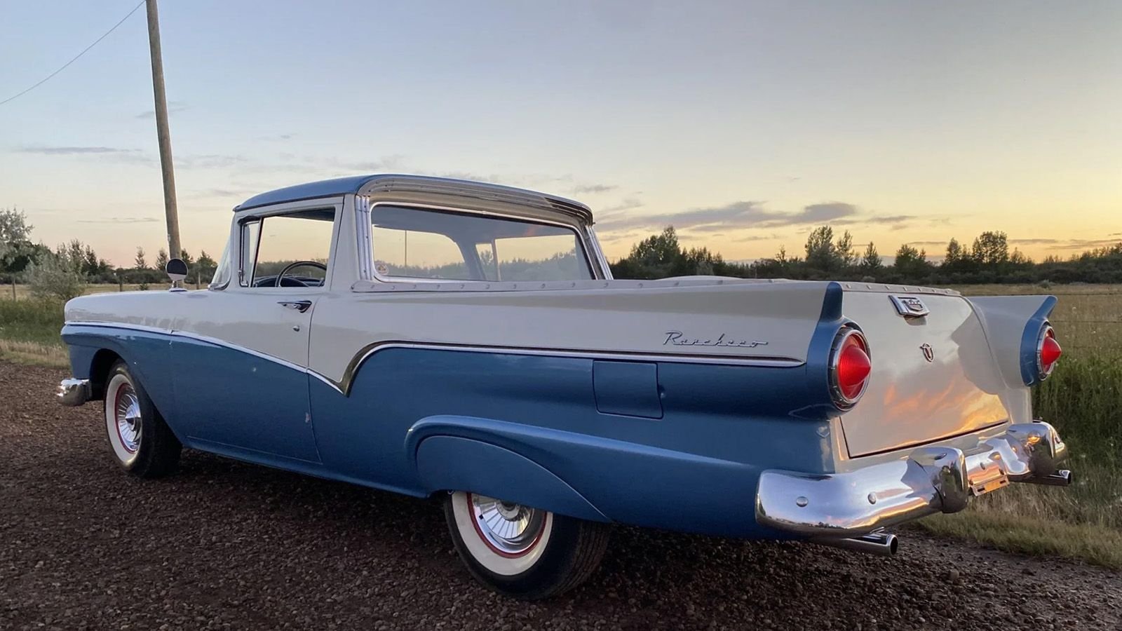 Pictures of sunsets are among the top images uploaded to the internet. Snaps of Ford Rancheros are a little further down the list. For best results, combining the two is a shutterbug's recommendation. A case in point is this 1957 Ranchero in 'Tu-Tone' Dresden Blue and Colonial White, and graced by an orange-tinged Western Canadian sunset. The outcome is picture-perfect.