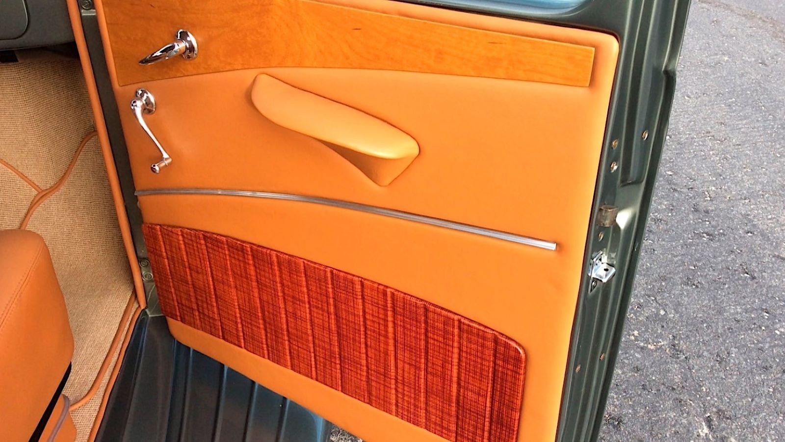 The same goes for the very attractive interior, most of which is now covered in brown leather, including the bench seat, door panels, and steering wheel. Tan carpet provides a nice bit of contrast, as does a classic white shift knob adorning the floor shifter.
