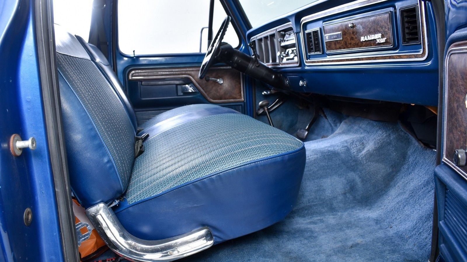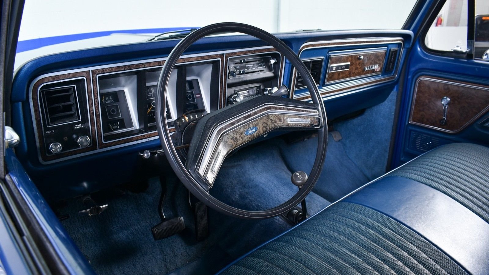 The interior of this F-250 is also quite gorgeous, adorned in a matching blue color. The split-folding bench seat allows access to the rear, where you can stuff more passengers. And all of the faux wood trim is intact and looking great as well.