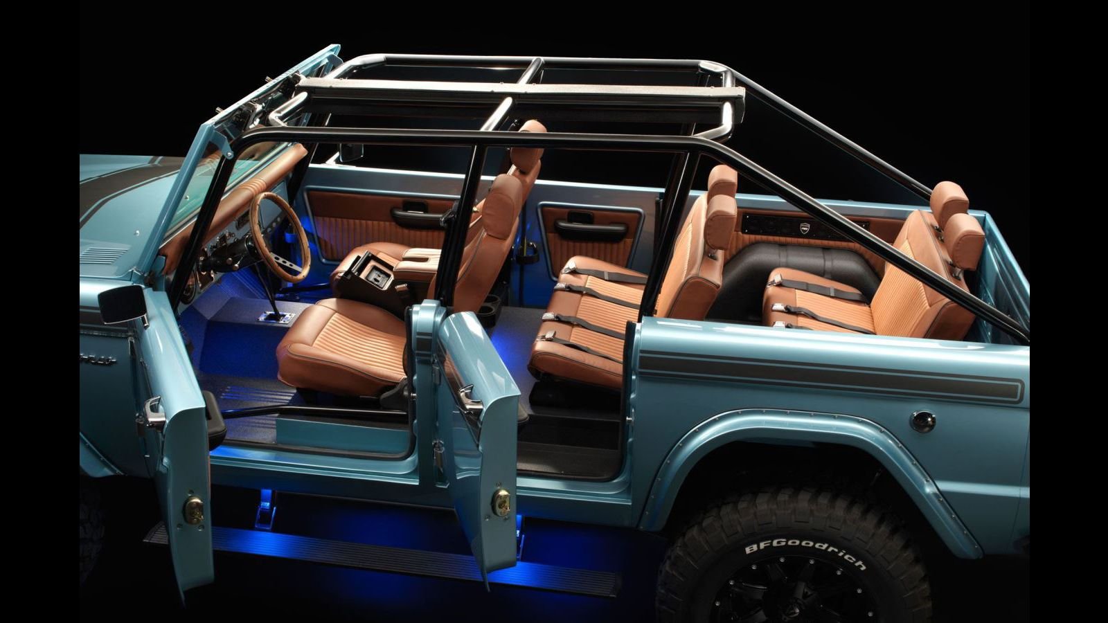 It would have been enough to restore the 1966 Bronco, bringing it back to its original glory. But with the theme of "future Bronco" in mind, they wanted to add some modern twists. They started off by adding 26 inches to the chassis in order to accommodate four doors rather than the original two. They also wanted to drop in a third row of seating, which is pretty much where this Bronco separates itself from the Jeep Wrangler that, although beloved in its own right, has barely enough room for two rows. Their idea here was to do something that hadn't been done before with other Bronco rebuilds, but also to show Ford what could be possible in mating a classic truck with modern needs and styling.