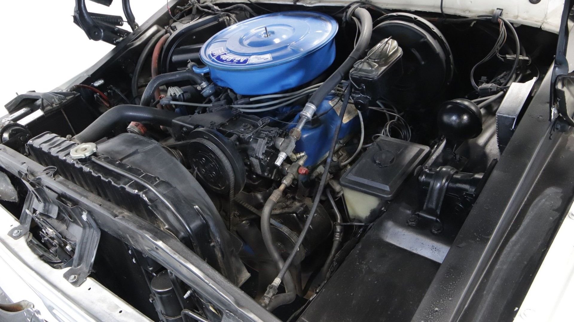 Lift the hood, and you'll find a 400 cubic-inch V8 sporting the familiar Ford blue on the block, air cleaner assembly, and valve covers. All the factory decals are in place as well, which is a nice touch. The engine sends power back through a three-speed automatic transmission, which joins other niceties like power brakes and steering.