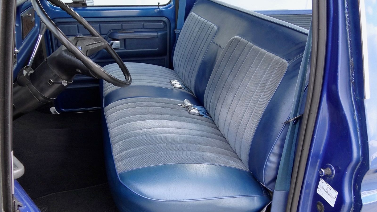 The interior is in equally beautiful condition with a cloth and vinyl wrapped blue bench seat. Options are few and far between, but everything from the dash to the door panels and even the faux wood trim appears to be in absolutely perfect condition.