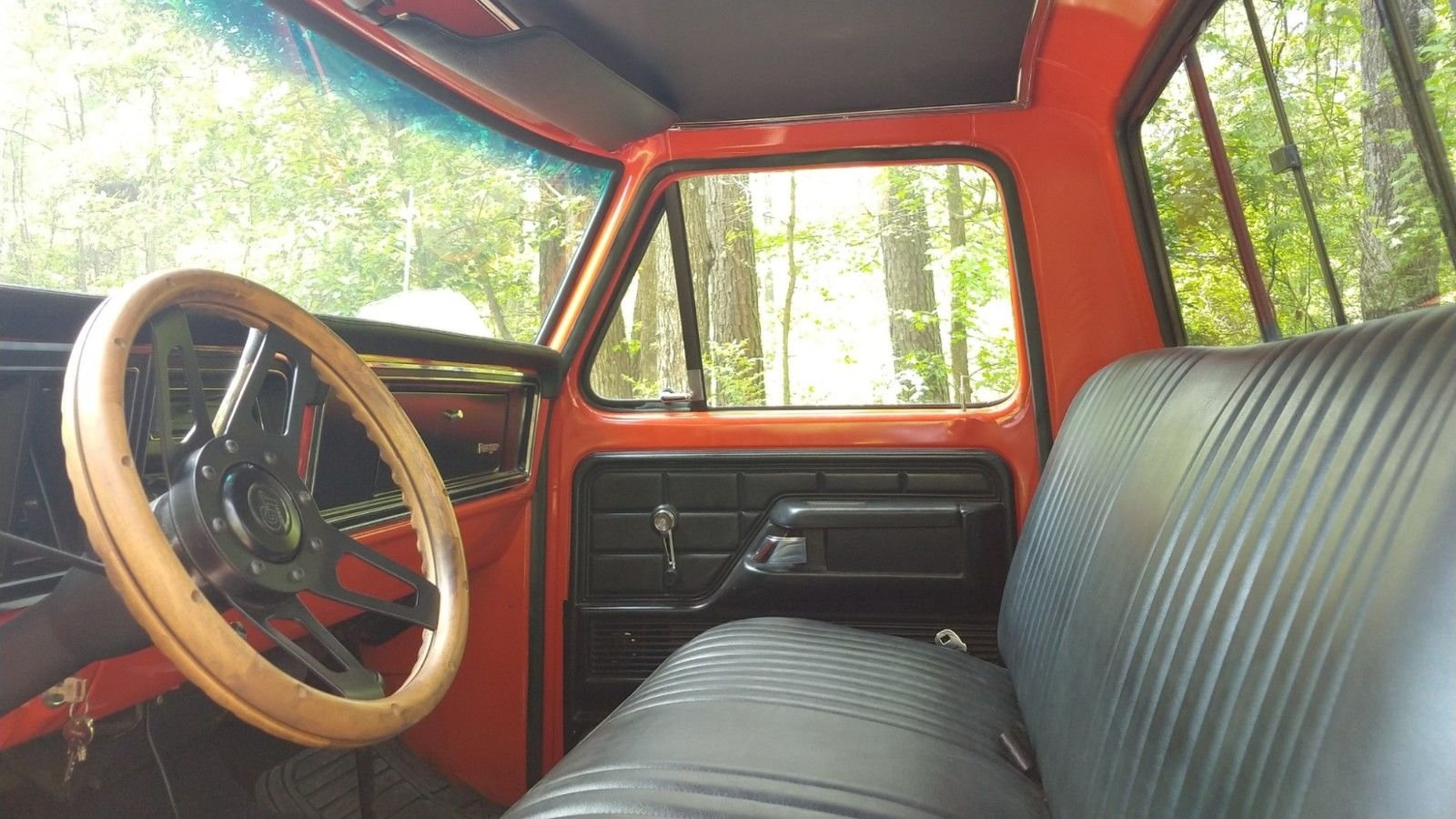 Inside, things look pretty normal with a familiar vinyl bench seat. The dash, carpet, trim, and headliner have all been replaced, and the seller added an aftermarket steering wheel and stereo as well.