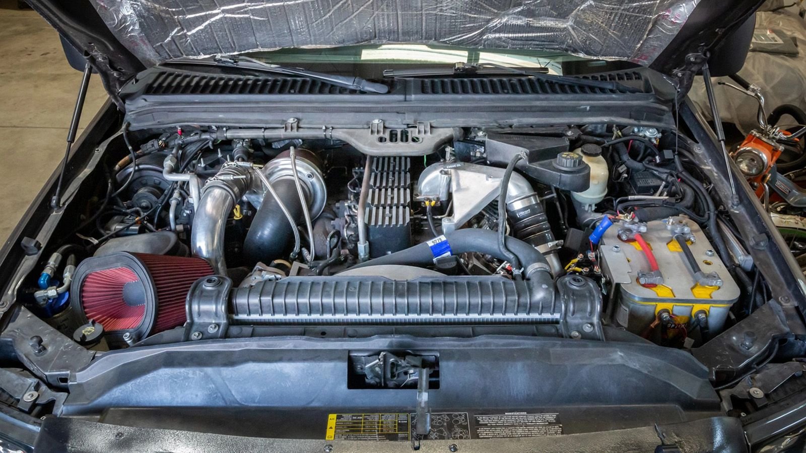 Service records for the EarthRoamer LT-V show that a 5.9-liter Cummins inline-six replaced the stock Powerstroke in 2017. Modifications to the Cummins included Mahle pistons, a Hamilton camshaft, and a compound turbocharger setup, in addition to billet input and mid-shafts for the OEM transmission. The truck is also equipped with a Pacbrake exhaust brake and twin Optima Yellowtop starting batteries.