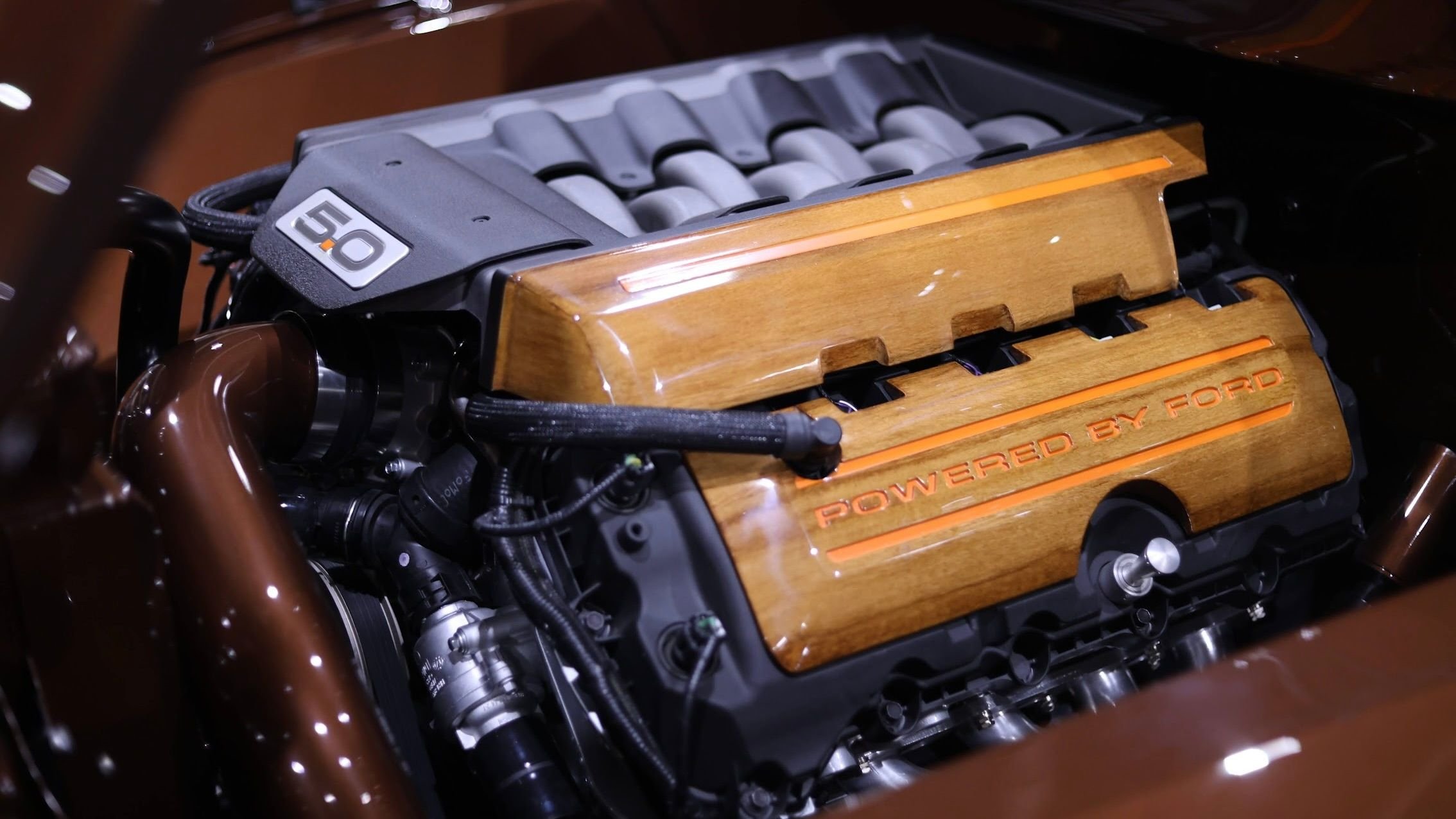 Take a peek under the forward-tilt hood, and one will find the aforementioned 5.0-liter Coyote V8, which in this case has been dressed to the nines with custom painted parts that perfectly frame it in the smoothed-out engine bay.