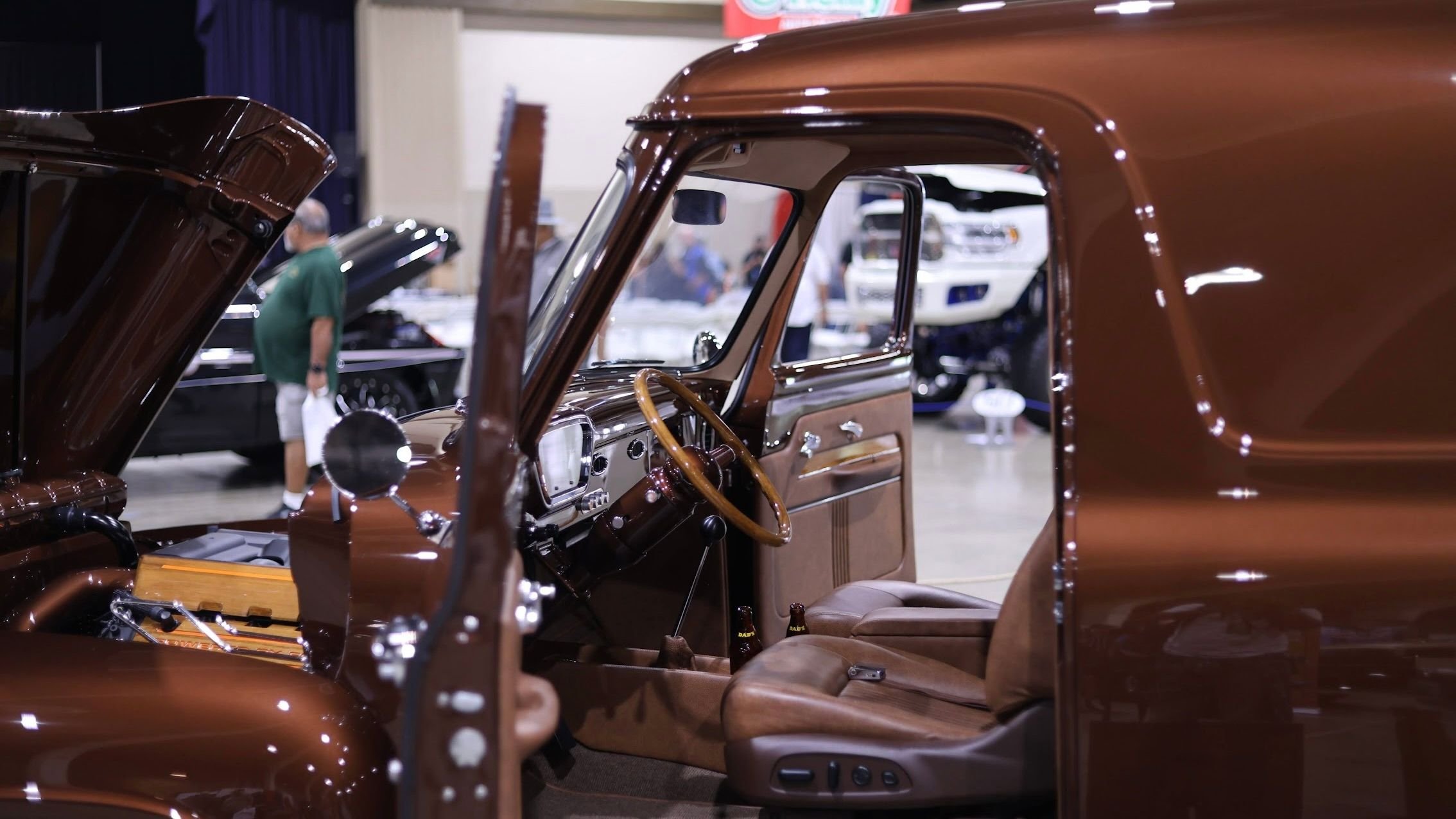 Inside the cabin, the owners will certainly be riding around in total comfort as well, thanks to a thoroughly modern cabin designed and executed by Gabe's Custom Interiors. Everything in sight is finished in a contrasting brown leather, and flanked by all the modern amenities one would expect to find in a top-notch restomod.