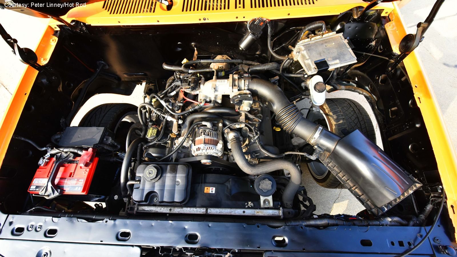 That doesn't mean they left the exterior of the pickup stock. The blacked-out Interceptor wheels were first on the chopping block, in their place roll TSW Alloy Wheels' Vale 19- and 22-inches, shod with low-pro Continental rubber. TMI shaved the trim and marker lights and deleted the fuel filler door, which they moved to the bed, and Johnny’s Auto Color and Body Werx in Riverside, California, sprayed the gold pearl tangerine color the truck now wears. Interceptor 4.6 badges from the dearly departed police car add the perfect finishing touches to the exterior.