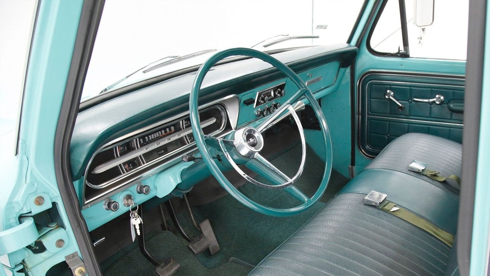 In addition to its remarkable stock condition, this 1967 F-100 has a few aftermarket add-ons. For easy highway cruising, a Gear Vendors overdrive unit was installed behind the factory 3-speed manual gearbox. A couple of Cherry Bomb mufflers also add a nice note to the dual exhaust. The pristine truck is tempting, but it comes at the cost of a lunar orbit.