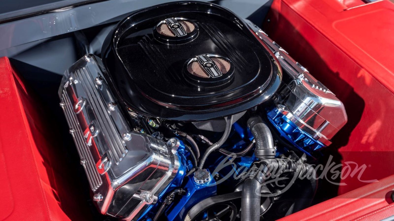 The big sled is powered by a second-gen 5.0-liter Coyote V8 that has been dressed to the nines with one-off two-piece billet valve covers and a custom air cleaner. The modern mill has received a few upgrades as well, including a dual throttle-body Holley Dominator EFI, C&R Racing radiator, Painless wiring, and MagnaFlow exhaust. It's mated to an MT82 6-speed manual transmission with a Hurst shifter that sends power back to a Currie rear end.
